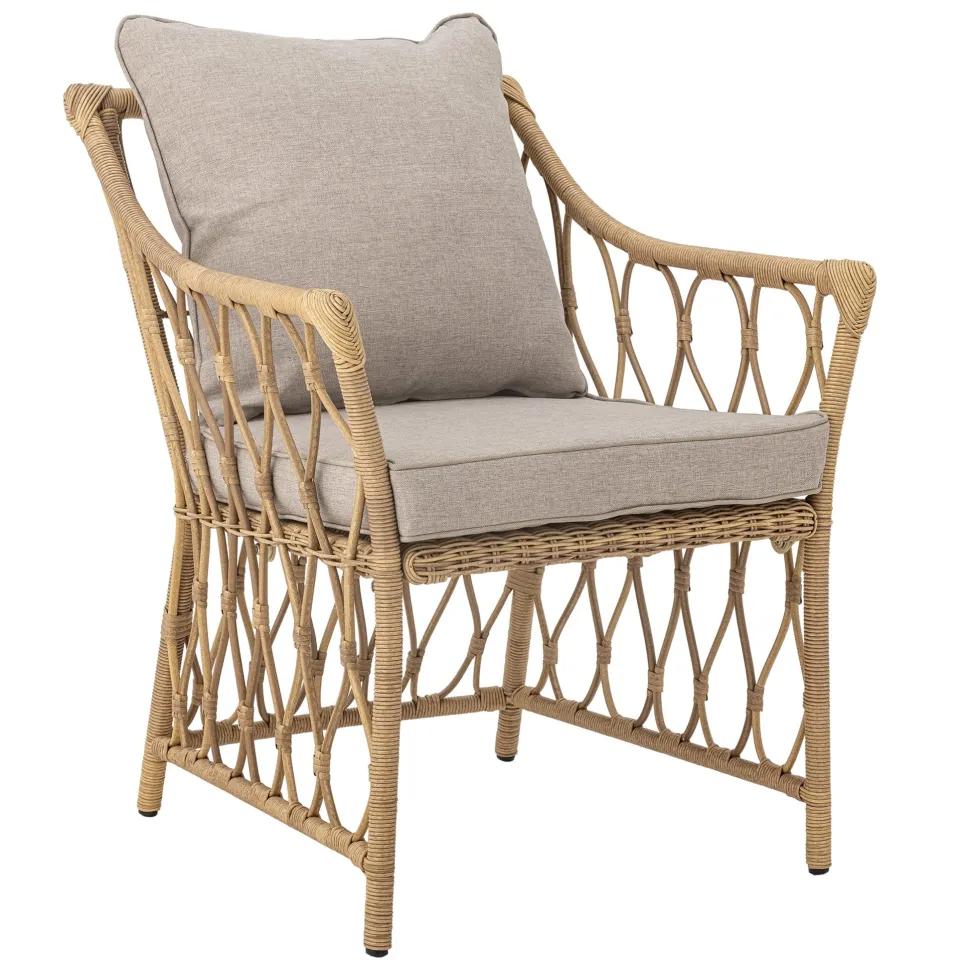Der Belluce Loungesessel mit Hocker von Bloomingville zeichnet sich durch ein gewebtes Poly-Rattan-Design aus und ist mit Kissen aus Polyester ausgestattet, die ein charmantes Leinen-Aussehen haben. Der praktische Hocker kann leicht unter den Stuhl geschoben werden, um Platz zu sparen. Wir empfehlen, Gartenmöbel in überdachten Bereichen aufzustellen.