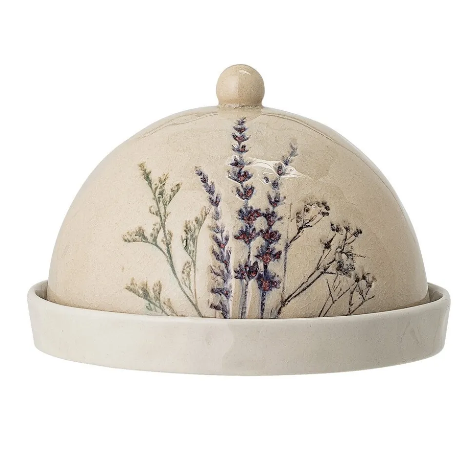 Diese zauberhafte Butterdose Bea aus Steingut von Bloomingville Cozy ist die perfekte Aufbewahrungsmöglichkeit für Käse und Butter. Unter der Crackle Glasur befindet sich ein wunderschönes Muster bestehend aus Lavendel Blüten. Alternativ kannst du sie als Serviertablett benutzen.