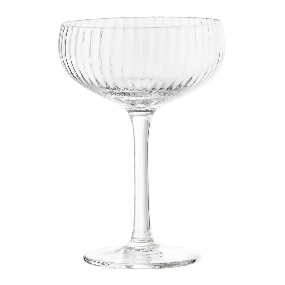 Das Astrid Champagnerglas von Bloomingville ist ein mundgeblasenes Glas mit einem geriffelten Design. Da es mundgeblasen ist, können kleine Luftblasen im Glas auftreten, die ihm ein einzigartiges Aussehen verleihen. Dieses elegante Glas kann zum Servieren von Champagner oder Cocktails verwendet werden und als dekoratives Element aufgestellt werden, wenn es nicht in Gebrauch ist.