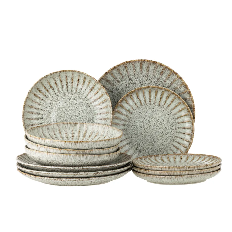 Fleur Geschirrset, Natur, Steingut von Bloomingville aus Dänemark. Das Geschirrset Fleur von Creative Collection wird aus Steinzeug mit einer reaktiven Glasur in Türkis- und Brauntönen hergestellt. Das schöne Farbspiel in der Glasur verleiht jedem Teller seinen eigenen, einzigartigen Ausdruck. Das Set besteht aus 4 x 3 Teilen: Essteller, Brotteller und tiefe Teller – perfekt für einen stimmungsvoll gedeckten Tisch.