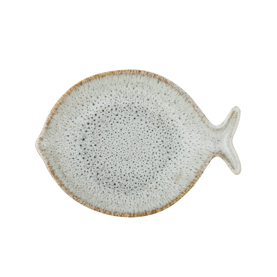 Fleur Servierplatte, Natur, Steingut von Bloomingville aus Dänemark. Die Servierplatte Fleur von Creative Collection ist aus Steinzeug gefertigt und hat die Form eines Fisches. Die gräuliche Glasur und die leicht rustikale Oberfläche verleihen der Schale Charakter und Persönlichkeit. Kleine Abweichungen können auftreten.