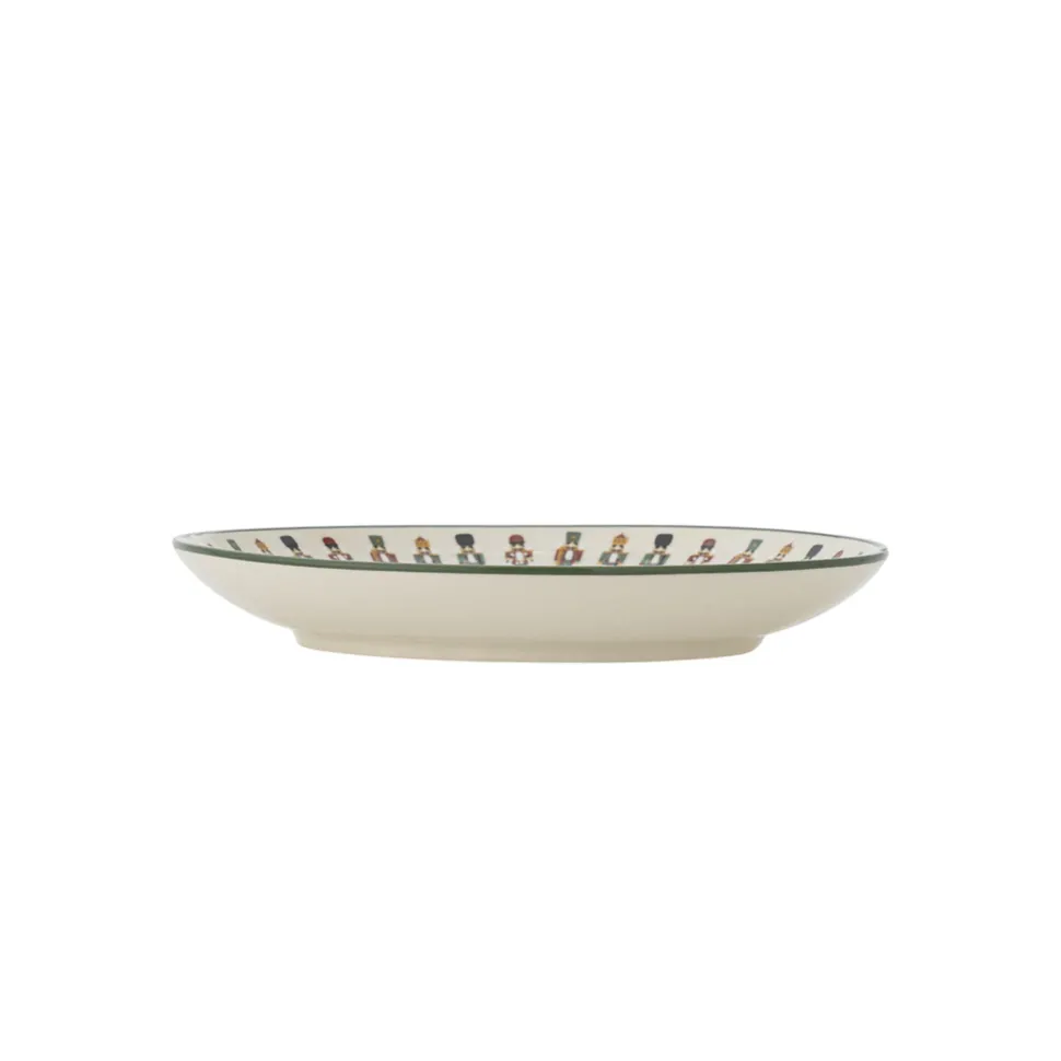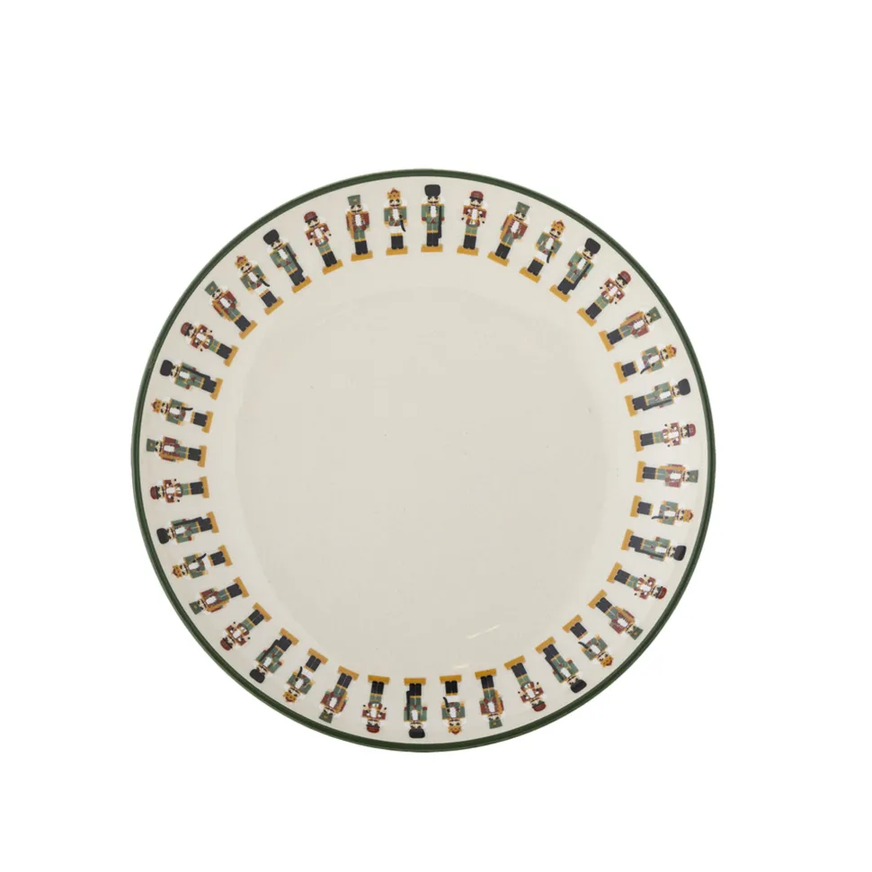 Jolly Teller, Grün, Steingut von Bloomingville aus Dänemark. Der Jolly Teller von Bloomingville ist ein charmanter Mittagsteller mit einem festlichen Druck von Nussknackern. Die feinen Details und bunten Motive verleihen der Tischdekoration eine spielerische und atmosphärische Note, während der handbemalte grüne Rand sicherstellt, dass jeder Teller einzigartig ist.
