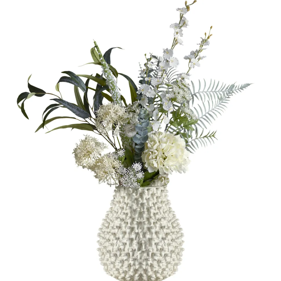 Künstlicher Blumenstrauß Symphonie, Weiß, Künstliche Blumen von Bloomingville aus Dänemark. Symphony Künstlich Blumenstrauß von Bloomingville weckt ein Gefühl von Harmonie und Sanftheit, das an ein beruhigendes Orchesterstück erinnert. Es präsentiert eine zarte Anordnung von Blumenelementen in sanften Weißtönen, Cremes und subtilen Grüntönen, die eine visuelle Melodie weben, die die Sinne anspricht. Jeder Stiel trägt zur Gesamtschönheit des Bouquets bei und spiegelt die subtilen Kontraste einer Symphonie wider. Perfekt für ruhige und nachdenkliche Momente lädt die Anordnung zur Bewunderung der sanften Eleganz der Natur ein. Schneiden und formen Sie die Stiele vor dem Gebrauch, um das natürliche Aussehen des Bouquets hervorzuheben und passen Sie sie an Ihre persönliche Dekoration an. In Papier eingewickelt. Vase nicht enthalten.