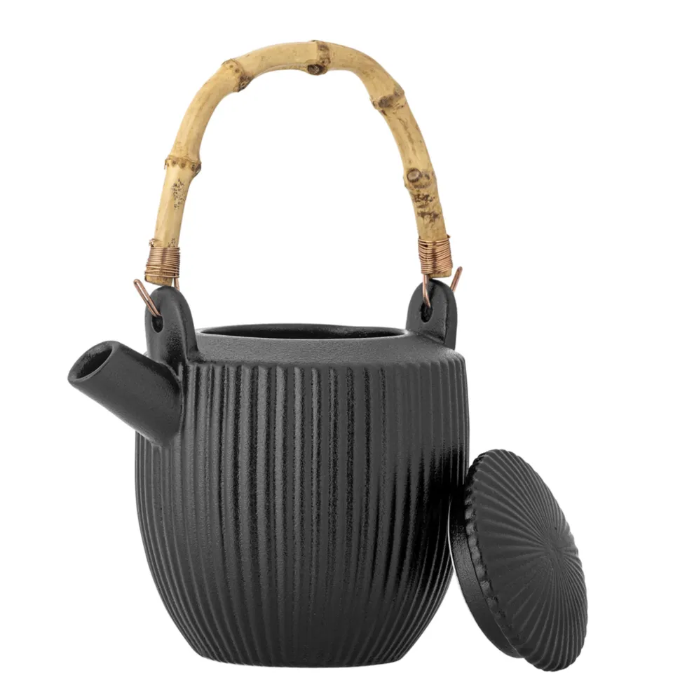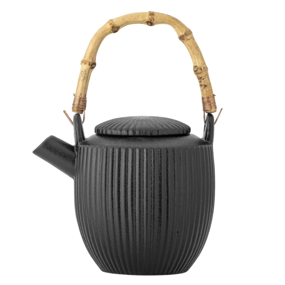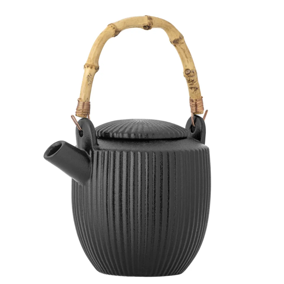 Neri Teekanne, Schwarz, Steingut von Bloomingville aus Dänemark. Die Neri Teekanne von Bloomingville besteht aus schwarzem Steinzeug mit einem minimalistischen und nordischen Design. Die klassische Form wird durch feine Details ergänzt, die dem einfarbigen Design einen dekorativen Akzent verleihen, während der Bambusgriff die Teekanne sowohl ästhetisch als auch funktional in der Küche macht.