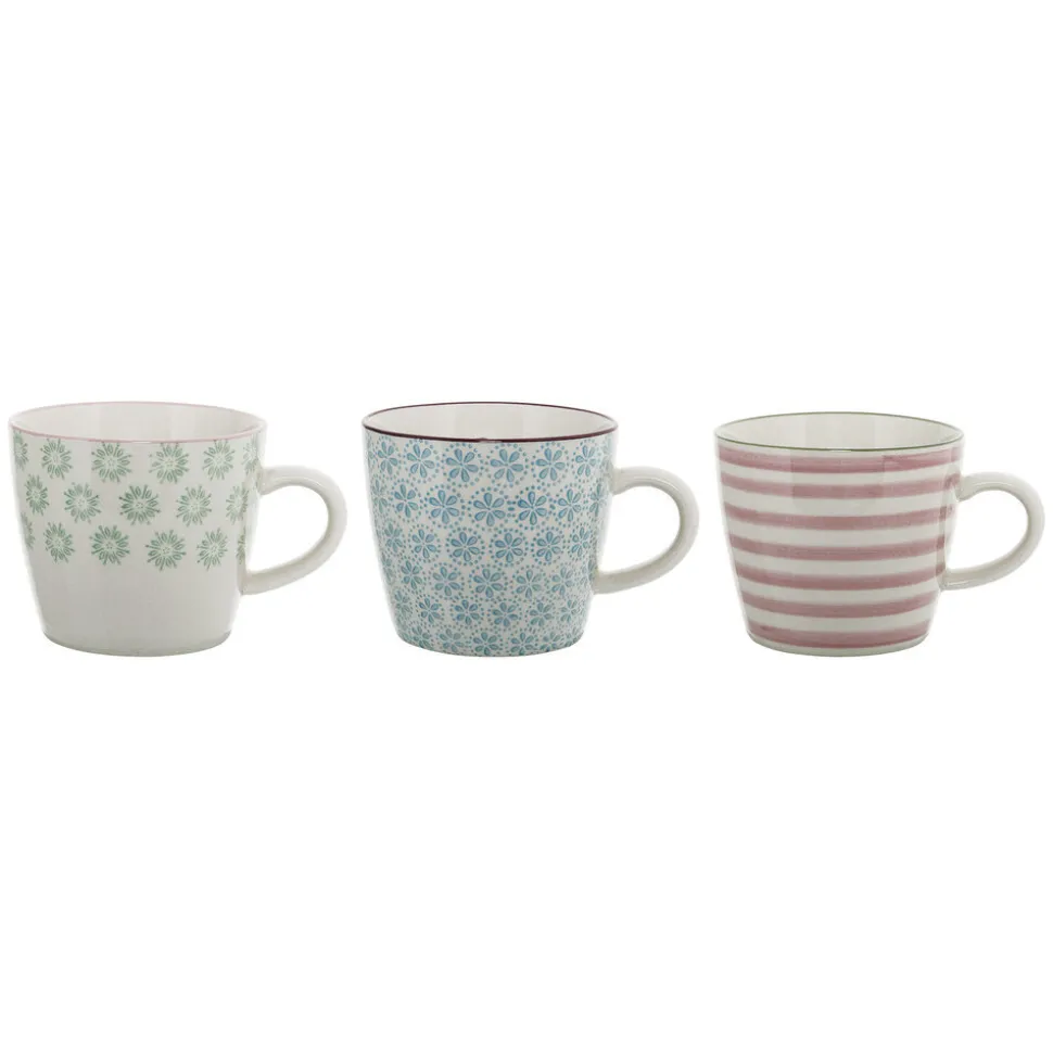 Patrizia Becher, 3er, Steingut von Bloomingville aus Dänemark. Die farbenfrohen Tassen Patrizia von Bloomingville sorgen ganz sicher für eine gemütliche Atmosphäre auf dem Tisch. Sie sind aus weißem Steinzeug gefertigt und haben ein charmantes glasiertes Muster in Farbtönen von Blau, Rot und Grün. Gemütlich, und dennoch schlicht und nordisch in ihrem Ausdruck.
