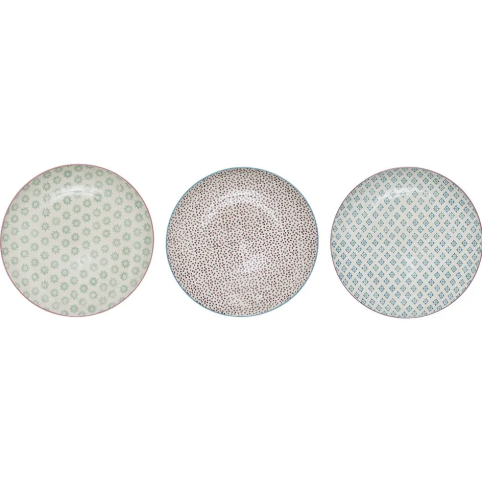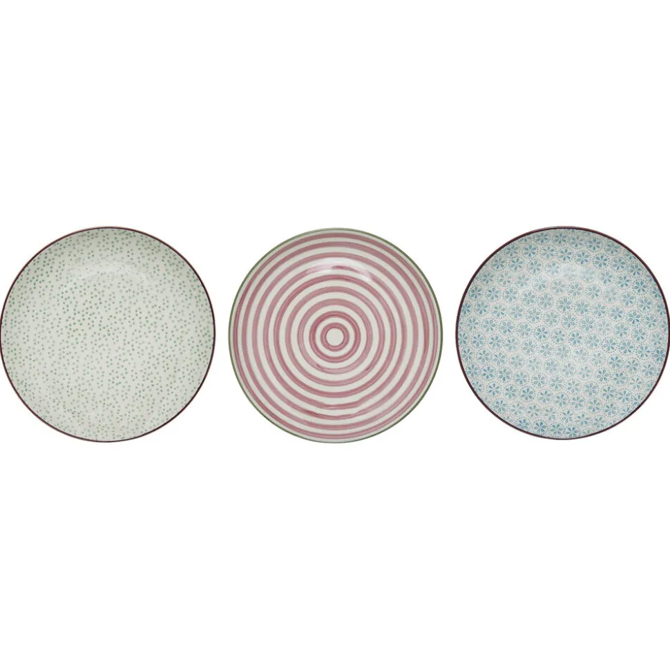 Patrizia Teller, 3er, Steingut von Bloomingville aus Dänemark. Die farbenfrohen kleinen Essteller Patrizia von Bloomingville sorgen ganz sicher für eine gemütliche Atmosphäre auf dem Tisch. Sie sind aus weißem Steinzeug gefertigt und haben eine Glasur in charmanten Farbtönen von Blau, Gelb, Rot und Grün. Gemütlich, und dennoch schlicht und nordisch in ihrem Ausdruck.