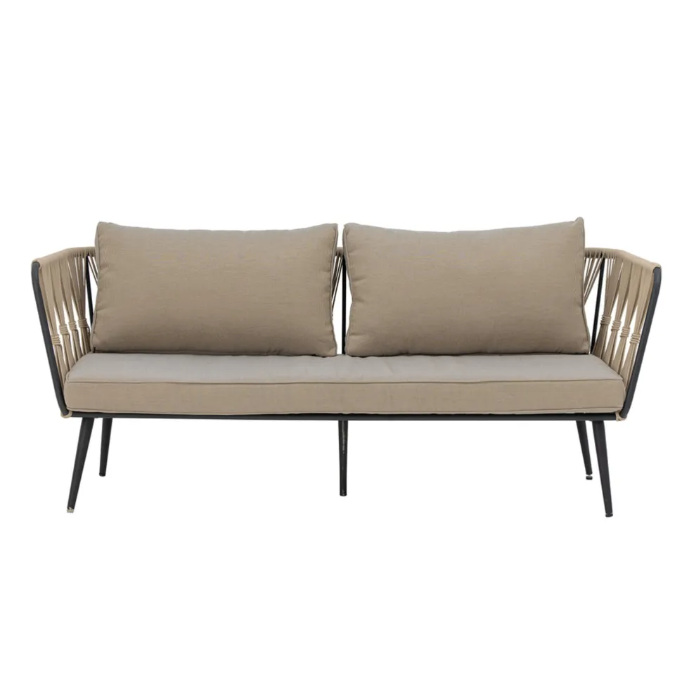 Pavone Sofa, Braun, Metall von Bloomingville aus Dänemark. Das Pavone Sofa von Bloomingville ist im nordischen Look mit wunderschönen Details gestaltet. Es besteht aus pulverbeschichtetem schwarzem Metall mit einer hellbraunen Polyester-Schnur, die von Hand auf den Rahmen gewebt ist. Die passenden Kissenbezüge in Beigetönen bestehen aus Polyester und können bei 30 Grad gewaschen werden. Das Gartensofa eignet sich für alle Außenbereiche, aber indem man das Sofa vor direktem Sonnenlicht schützt, wird die Farbe des Stoffes und die Haltbarkeit des Sofas verlängert. Genießen Sie ein wunderschönes Outdoor-Sofa mit hohem Komfort.