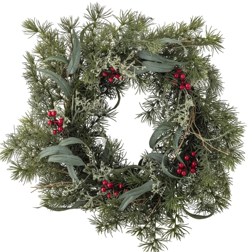 Pine Kranz, Künstlicher Weihnachtskranz von Bloomingville aus Dänemark. Der Pine Kranz von Bloomingville besteht aus künstlichen Tannenzweigen und dekorativen roten Beeren, die sofort weihnachtliche Stimmung in jeden Raum bringen. Ideal zum Aufhängen an der Haustür oder als stilvolle Wanddekoration, um eine festliche Atmosphäre ohne Pflegeaufwand zu schaffen.