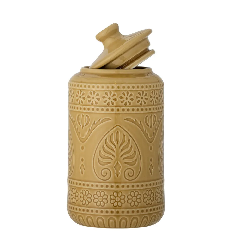 Rani Gefäß mit Deckel, Gelb, Steingut von Bloomingville aus Dänemark. Der Rani Tiegel mit Deckel von Bloomingville ist eine Erweiterung der schönen Rani-Serie. Er hat eine schöne gelbe Farbe, die allen Tischen eine freudige Note verleihen wird. Der Tiegel ist eine perfekte Ergänzung für Ihre Küche, wenn Sie etwas suchen, das nicht nur funktional ist, sondern auch gut aussieht. Aufgrund der Beschaffenheit der Glasur können Farbvariationen auftreten.