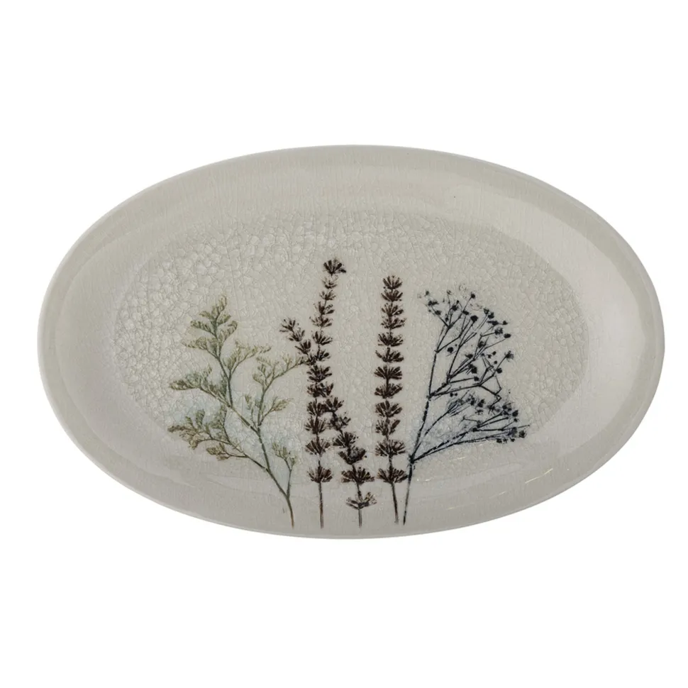 Bea Servierplatte, Natur, Steingut von Bloomingville aus Dänemark. Die Bea Servierplatte von Bloomingville ist eine Erweiterung der schönen Bea-Serie. Das Tablett ist aus Steingut gefertigt und hat einen Naturton mit zarten floralen Prägungen in der Craquelé-Glasur. Das Tablett ist perfekt für Schmuck und Seifen im Badezimmer oder zum Servieren in der Küche. Jedes Stück wird aufgrund des Materials und der Handarbeit anders und einzigartig sein.