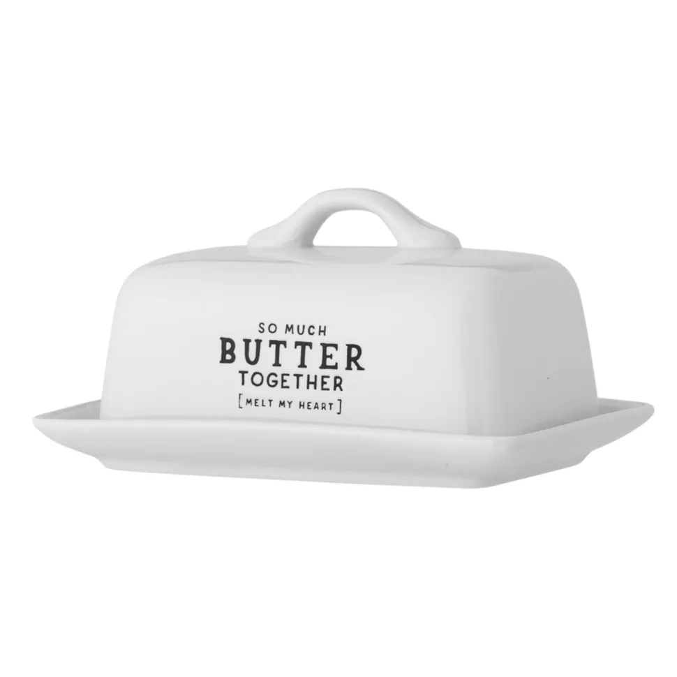 Wendy Butterdose, weiß, Steingut von Bloomingville aus Dänemark. Wendy Butterdose von Creative Collection mit dem Zitat „so much butter together (melt my heart)“ ist eine gemütliche und praktische Aufbewahrung für Butter. Die Butterdose ist mit einem Griff versehen, der das Anheben des Deckels und das Servieren der Butter auf dem Unterteller erleichtert. Das süße und lustige Design ist aus Steingut mit einer weißen Glasur und schwarzem Druck gefertigt.