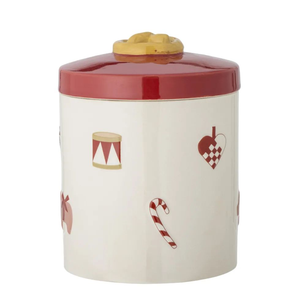 Yule Gefäß mit Deckel, Weihnachten, Steingut von Bloomingville aus Dänemark. Bewahren Sie die Weihnachtsleckereien in der Dose mit Deckel Jolly von Bloomingville aus Steinzeug auf. Die hübsche Dose ist mit nostalgischen Illustrationen und einem geprägten Muster gestaltet. Nutzen Sie sie zur Aufbewahrung oder einfach nur als Dekoration in der Weihnachtszeit.