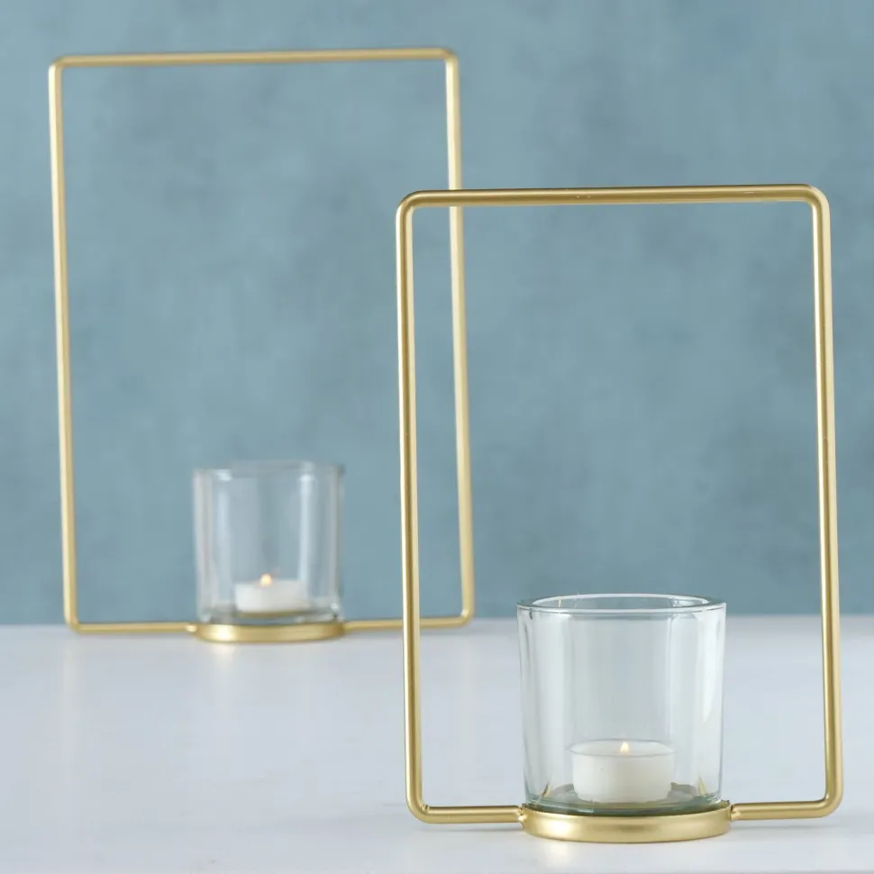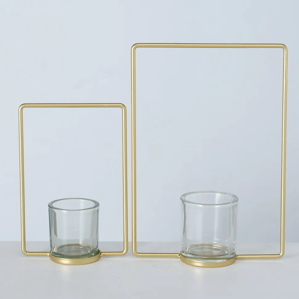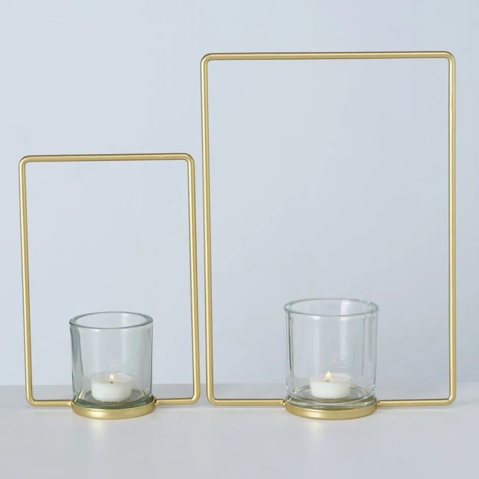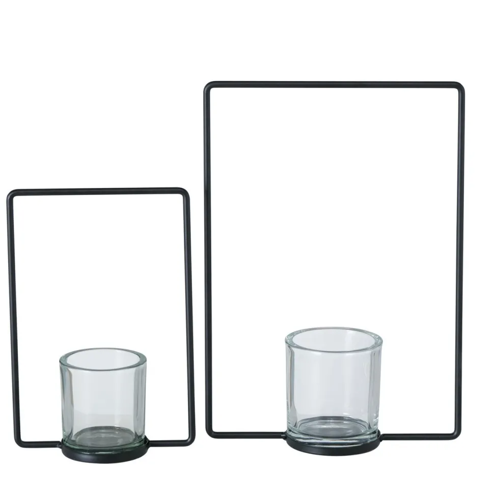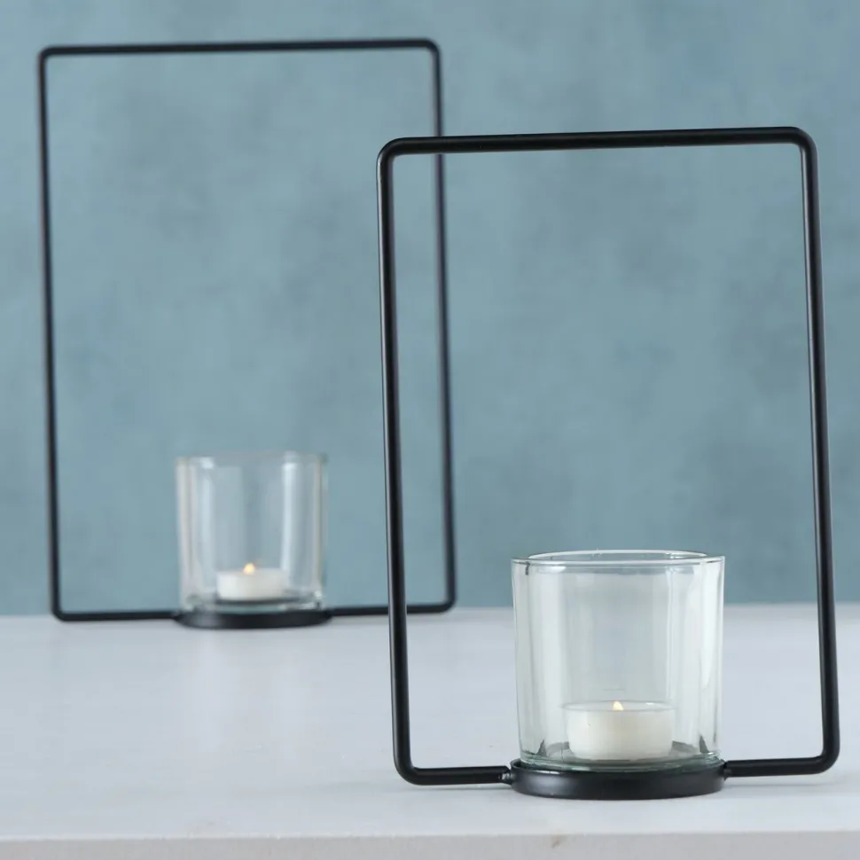 Diese zwei handgearbeiteten Teelichthalter im 2er Set eignen sich wunderbar um tolle Akzente im Wintergarten oder im Schlafzimmer zu setzen. Im Wintergarten auf einem kleinen Beistelltisch neben einer Grünpflanze oder im Schlafzimmer auf der Kommode, sehen diese zwei Teelichthalter toll aus! Die Teelichtgläser sind mit einem Eisenrahmen umrandet und sind für den Innenbereich geeignet.