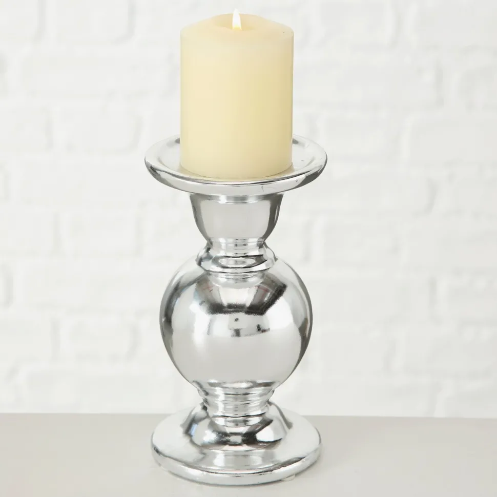Schöner silberfarbender Kerzenleuchter Adelia aus Dolomit von Boltze. Der Kerzenleuchter rundet Kommoden, Tische und Fensterbänke dekorativ ab und ist ein echter Blickfang. Außerdem erschafft er Abends eine gemütliche Atmosphäre durch angenehmen Kerzenschein.