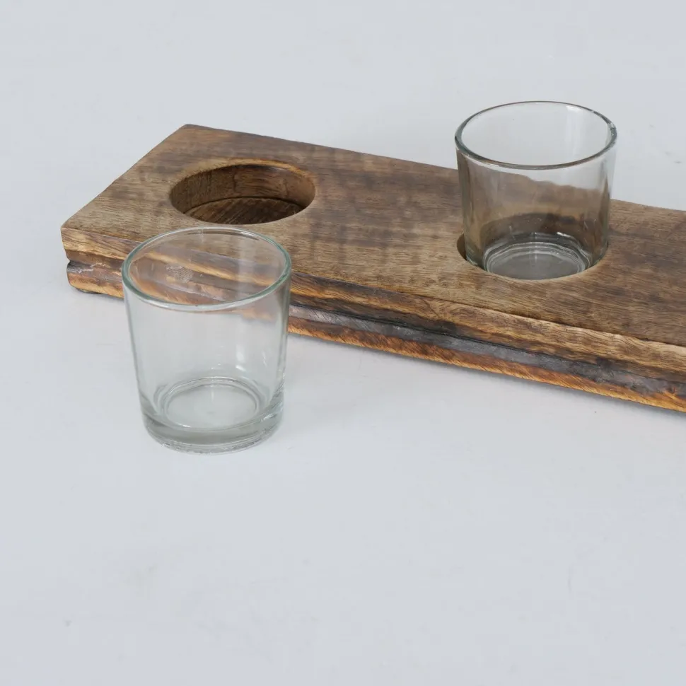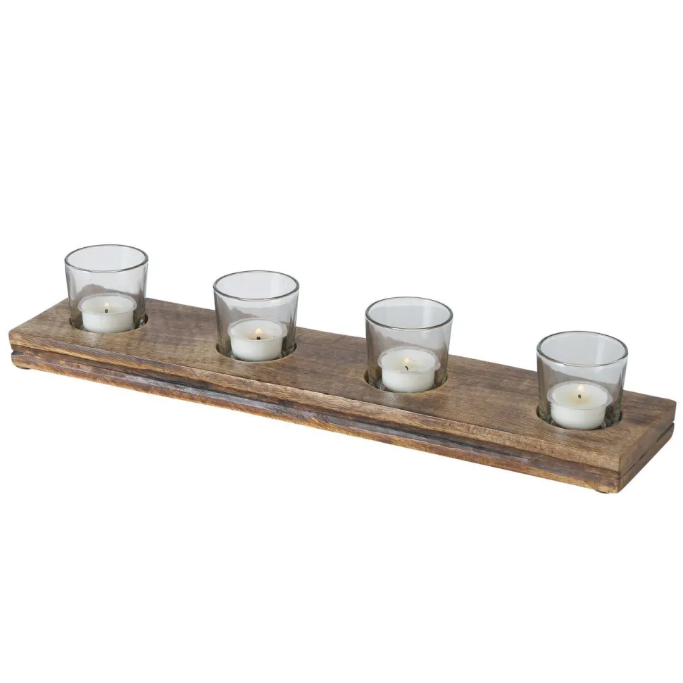 Dieser schöne Teelichthalter Rieseby von Boltze ist ein vielseitiges Dekoelement für jegliche Oberflächen in deinem Zuhause. Das Tablett besteht aus wunderschönem Mangoholz und die Teelichthalter selbst bestehen aus klarem Glas. Lege eine kleine Girlande zwischen die Gläser mit Glasperlen und Zapfen als kleine Hingucker.