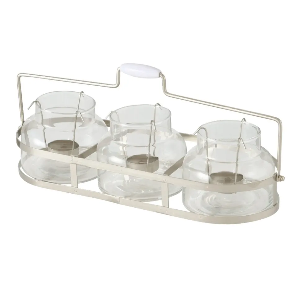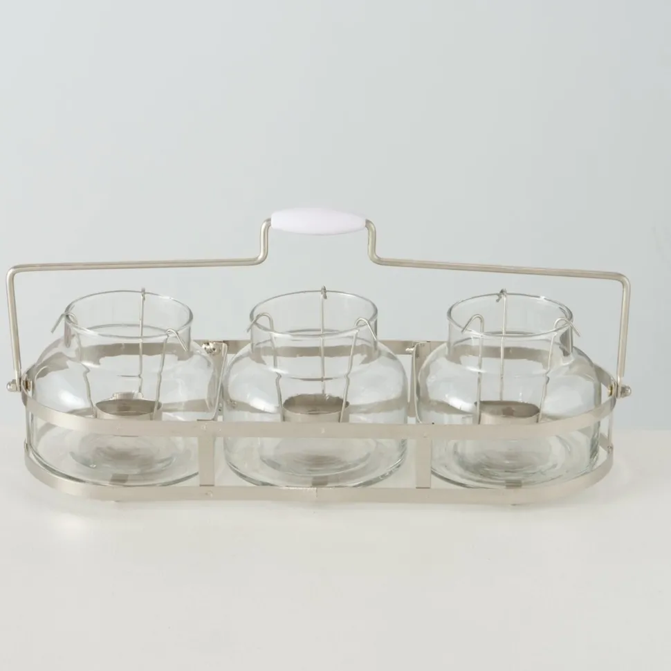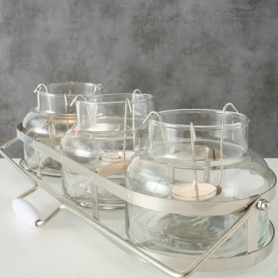 Dieser hinreißende Teelichthalter Wega von Boltze Ostern bringt wunderschönes Funkeln auf eine Oberfläche deiner Wahl. Die klaren Teelichtgläser stehen in einem Metall Gestell mit Griff in glänzendem silber. Stelle jeweils ein Teelicht in ein Glas und erfreue dich an der gemütlichem Atmosphäre.