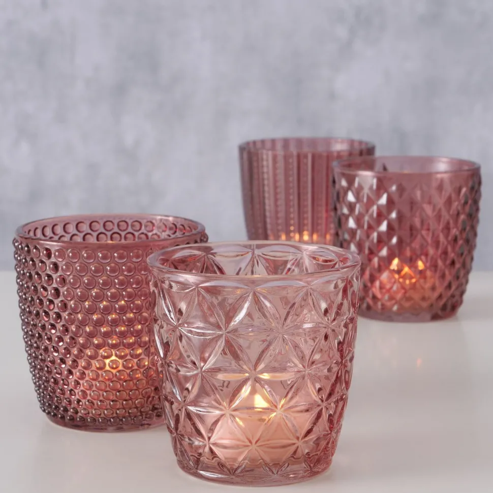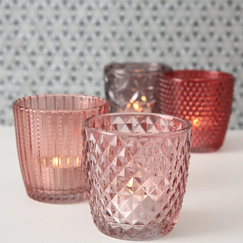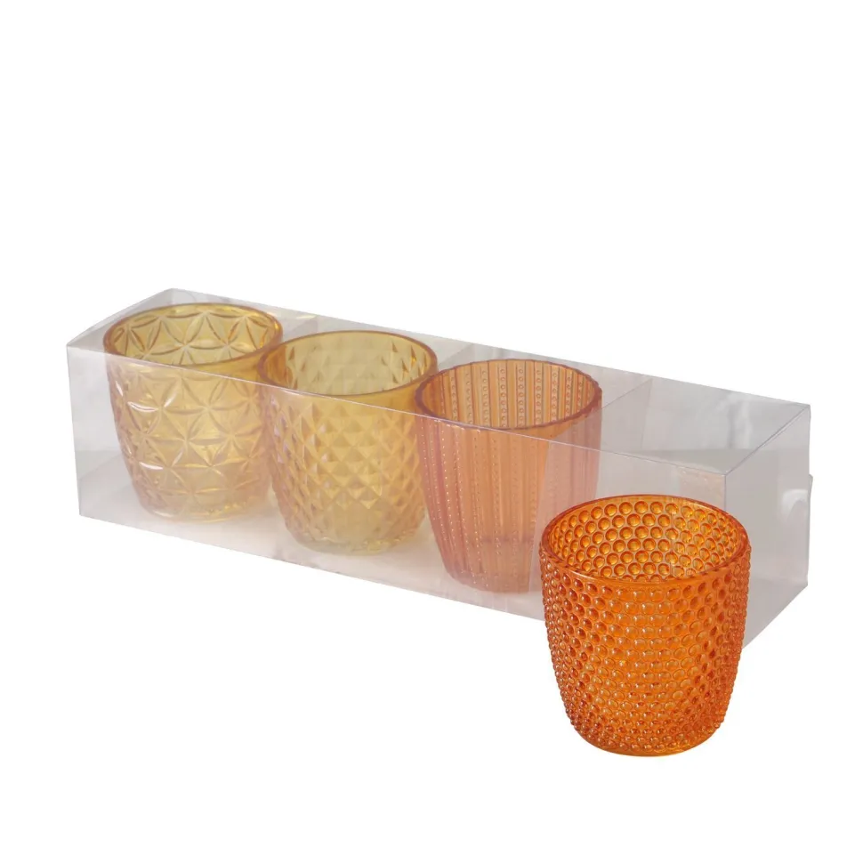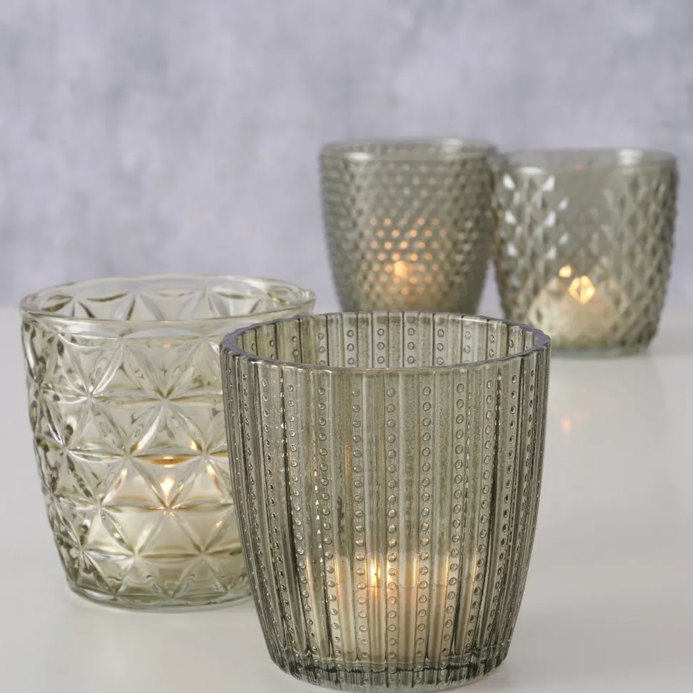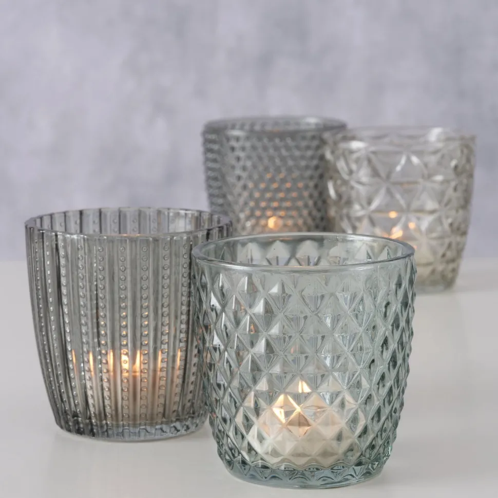 Das Set besteht aus vier Gläsern mit verschiedenen Mustern in der Oberfläche. Es kann wunderbar zusammen gestellt werden, oder aufgeteilt und an verschiedenen Orten platziert werden.