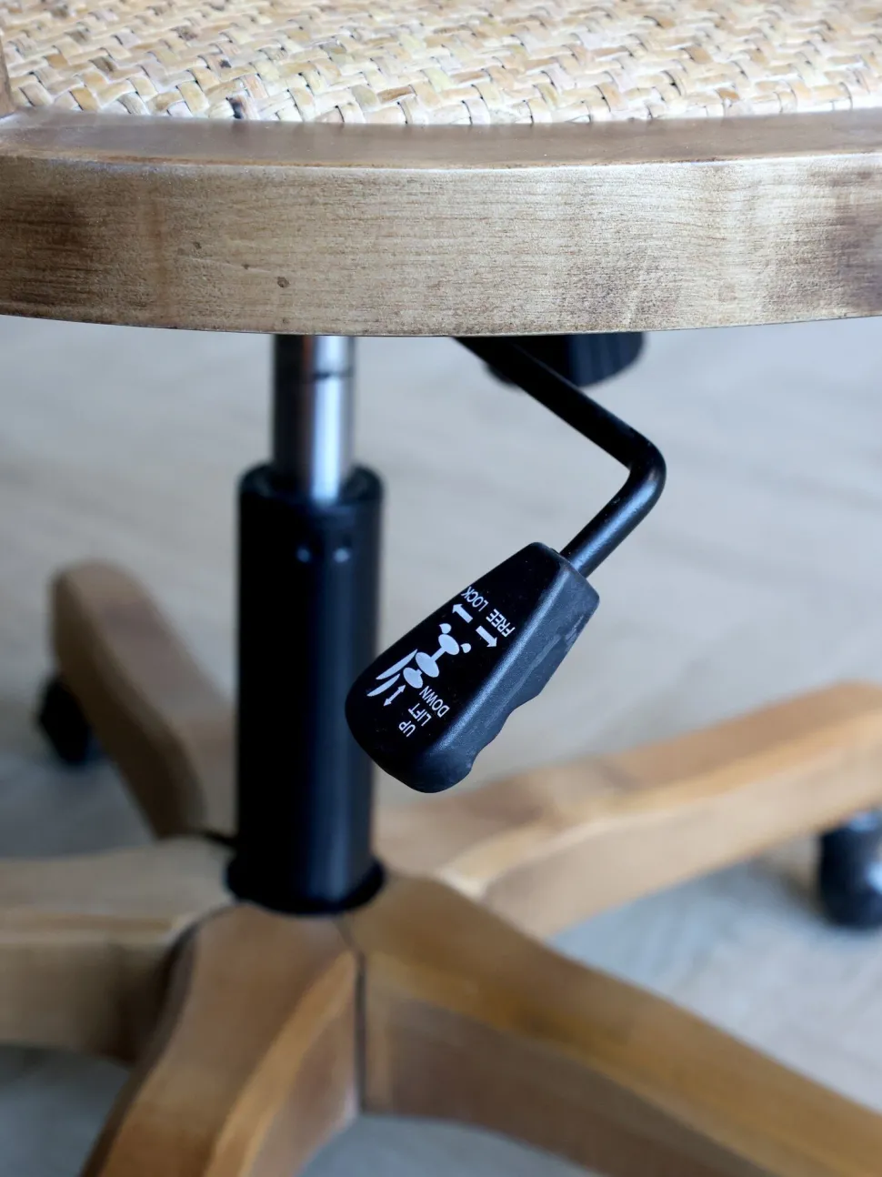 Die Rücken- und Armlehnen sind geformt, um hervorragenden Komfort zu bieten, und mit einem Griff können Sie die Sitzhöhe nach Ihren Wünschen einstellen. Die Räder passen perfekt zum Design mit ihrem antiken Eisenaussehen.