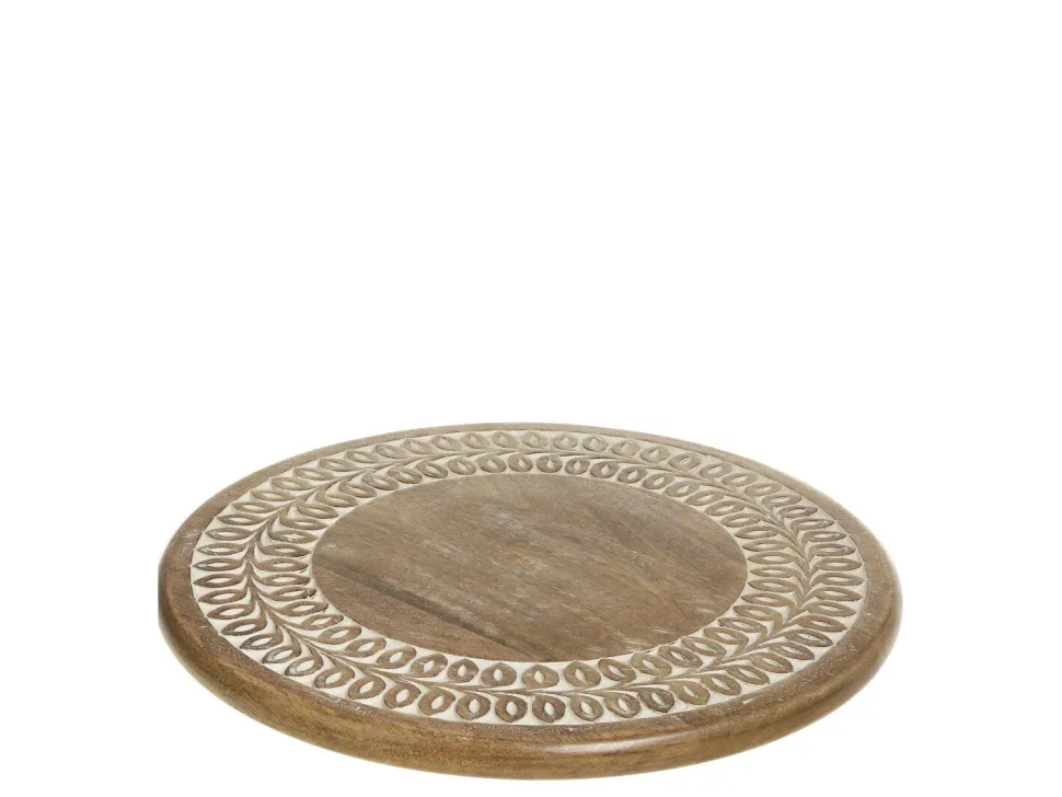Das Drehtablett, auch Lazy Susan genannt, ist aus massivem Mangoholz mit einem schönen Schnitzmuster und weißer Umrandung gefertigt. Es ist lebensmittelecht und ein Muss in jeder Küche.