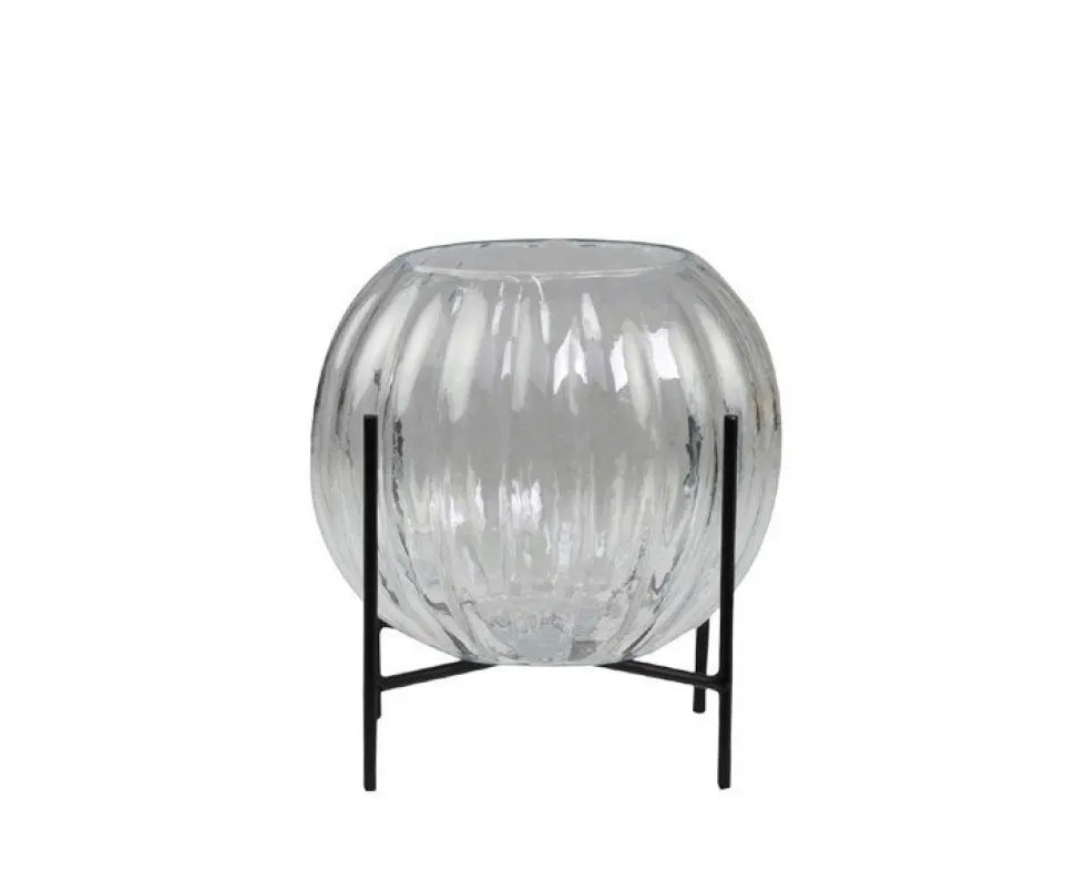 Diese schöne und kugelige Vase aus Glas von Chic Antique ist der ideale Aufbewahrungsort für Blumensträuße oder andere Verzierungen. Sie wird auf einem schwarzen Ständer platziert und hebt somit das häusliche Wohlbefinden auf ein höheres Level.