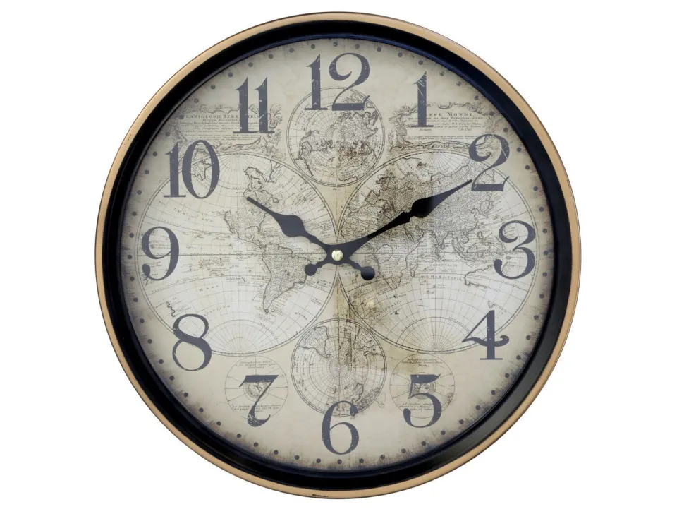 Hier kommt Reisefeeling auf. Die Vintage-Wanduhr von Chic Antique zeigt dir die ganze Welt. Dabei werden Weltkarte und Vintage-Stil von einem goldenen Rand verziert, der dem Deko-Objekt seinen Glanz verleiht.