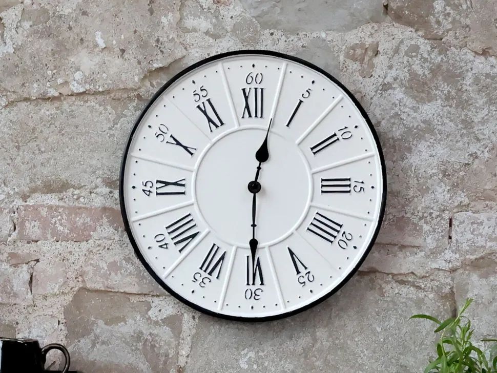 Wunderschöne Wanduhr von Chic Antique mit einem erstaunlichen Vintage-Look. Das Design zeigt Spuren des französischen Landhausstils und erinnert an eine alte emaillierte Uhr. Die Zahlen und römischen Ziffern sind direkt in die Zifferblattoberfläche geprägt.