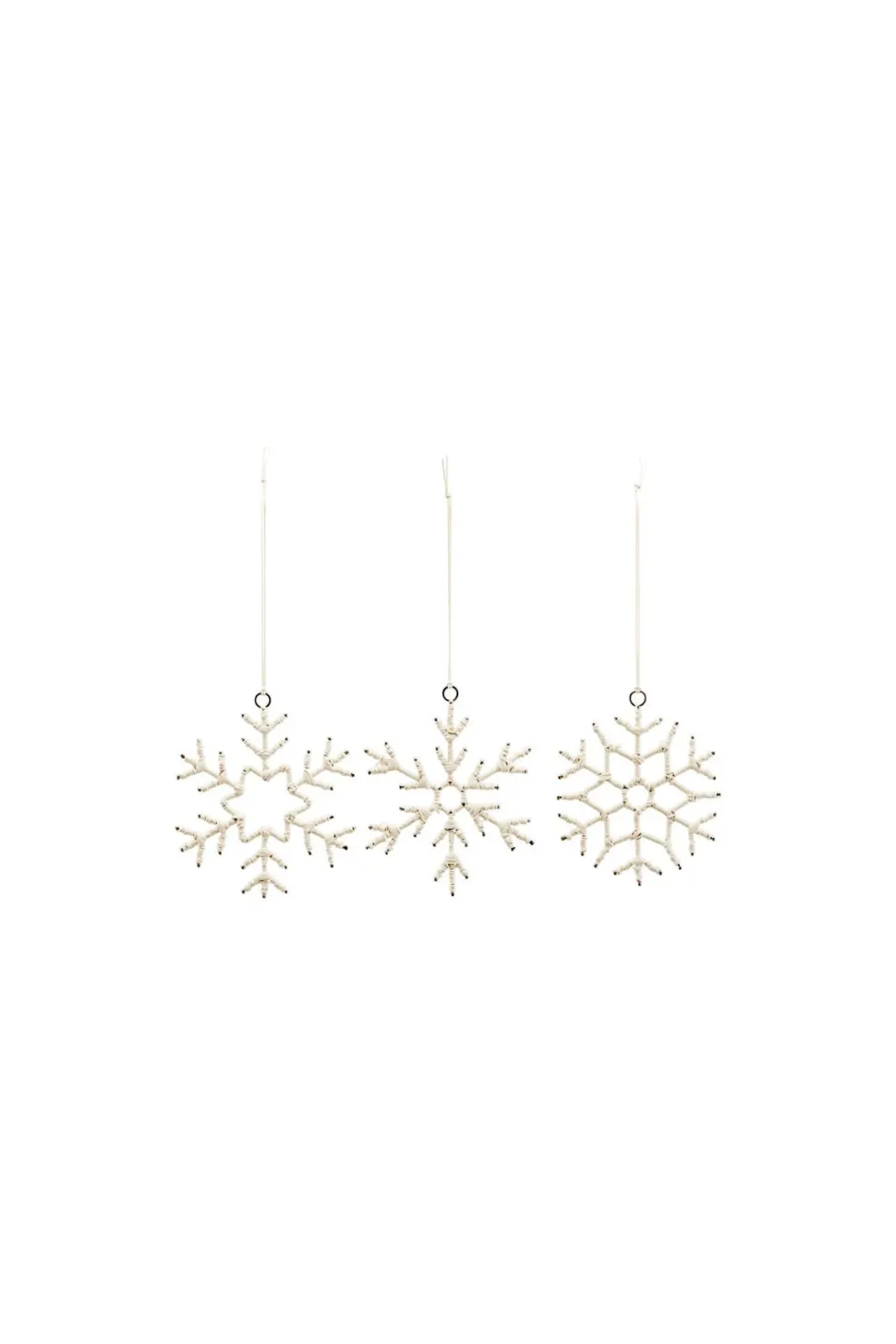 Dieses Set von House Doctor besteht aus drei wunderschön geformten Schneeflocken und kann sich an jedem Weihnachtsbaum sehen lassen. Die Ornamente sind aus Eisen und mit weißer Baumwollschnur umwickelt, wodurch sie einen einzigartigen Look erhalten. Besonders in Kombination mit anderen Kugeln, Materialen und Formen sind diese Schneeflocken an jeden Weihnachtsbaum gut aufgehoben und verleihen diesem eine sanfte Abwechslung. Schaffe dir dein eigenes Winter Wonderland mit diesen Schneeflocken Aufhängern und verziere auch andere Bereiche wie zum Beispiel dein Fenster damit.