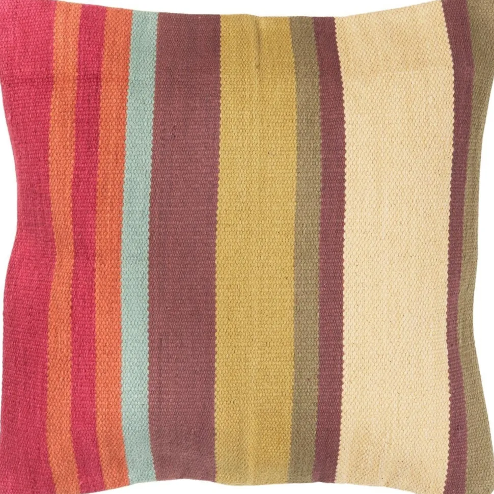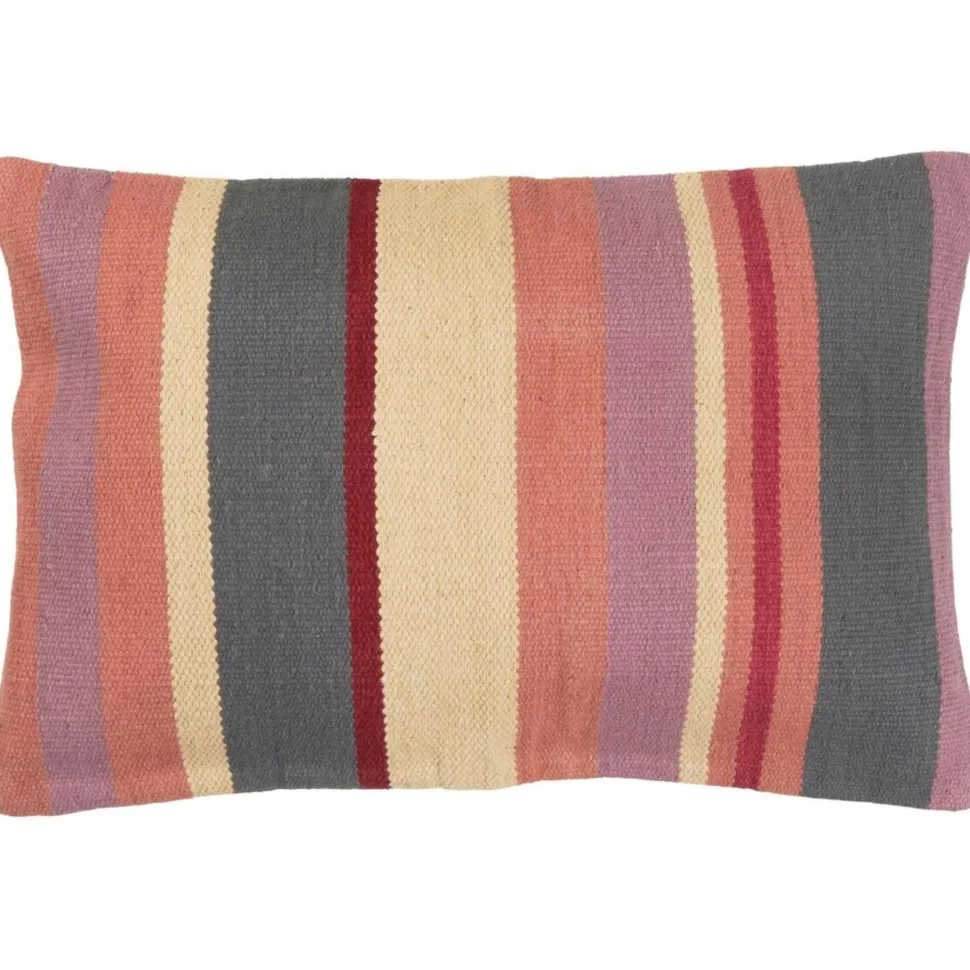 Gestreifter Kissenbezug aus grob gewebter Baumwolle, mit Rückseite aus ungebleichtem Leinen.