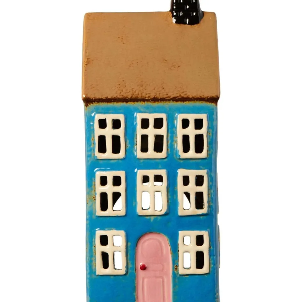 Teelicht-Haus aus Keramik blau mit hellrosa Tür von IB Laursen aus Dänemark.