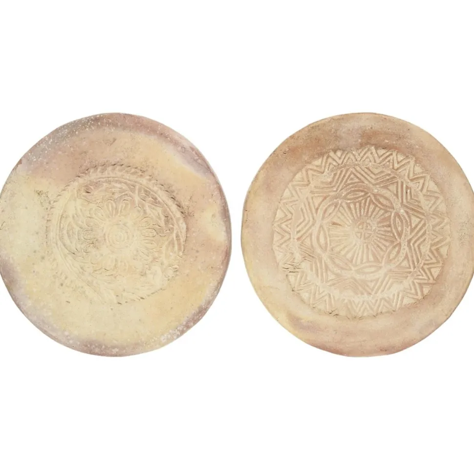 Einzigartige Terrakotta Untersetzer mit aufwendigem Blumenmuster. Durch die Beschaffenheit sieht jeder Untersetzer einzigartig aus und kann sich in Form und Farbe unterscheiden. Filzpunkte auf der Unterseite sorgen für sicheren Halt.