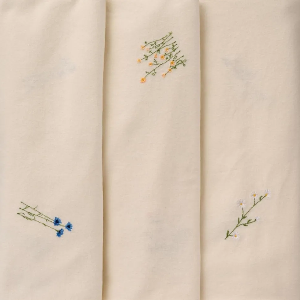 Elegante Tischdecke in der klassischen Butter Cream-Farbe mit zarter Stickerei von Margeriten, Kornblumen und Butterblumen. Ideal, um Ihrer Tischdekoration eine natürliche und charmante Note zu verleihen. Verwenden Sie sie mit den passenden Stoffservietten, um einen eleganten und harmonischen Tischlook zu kreieren.