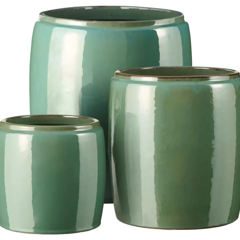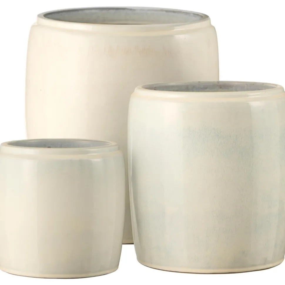 Set aus 3 zylindrischen Töpfen in einem dezenten Grauton, bei dem die rustikale Glasur schöne, changierende Details hervorhebt. Die schlichte und vielseitige Form der Töpfe harmoniert mit sowohl Blumen als auch grünen Pflanzen.