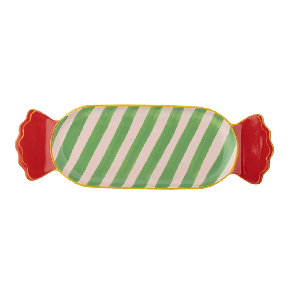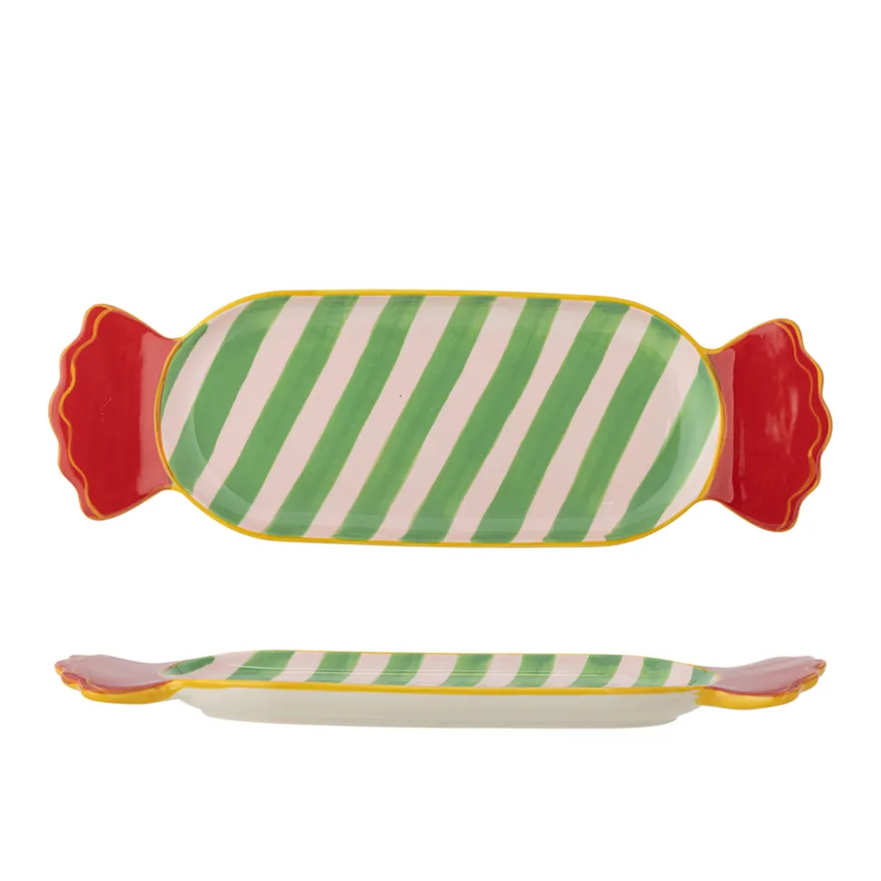 Caramella Servierplatte Grün aus Steingut von Bloomingville aus Dänemark. Die Caramella Servierplatte von Bloomingville ist wie ein Karamellstück geformt und mit handbemalten Details verziert, die jede Platte einzigartig machen. Die lebendigen Farben und das auffällige Design verleihen sowohl alltäglichen als auch festlichen Mahlzeiten eine verspielte und farbenfrohe Note.