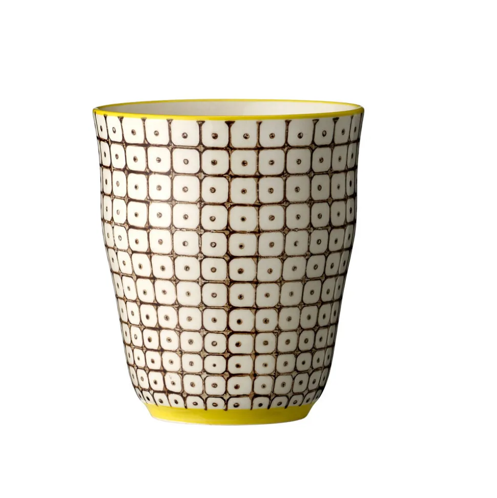 Carla Becher, Steingut von Bloomingville aus Dänemark. Die Becher Carla ohne Henkel von Bloomingville haben ein rustikales viereckiges Muster und sind in sechs Farben erhältlich. Die Kante an jedem Becher hat eine schöne Kontrastfarbe. Wählen Sie Ihren Favorit aus!
