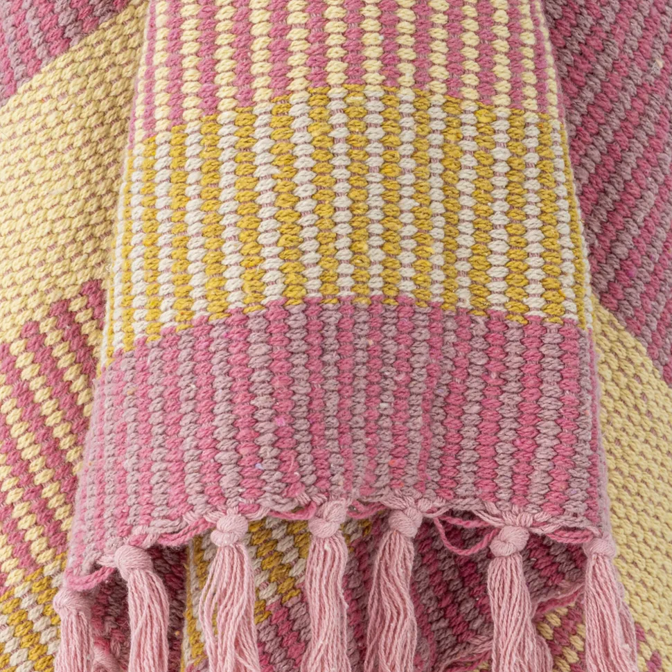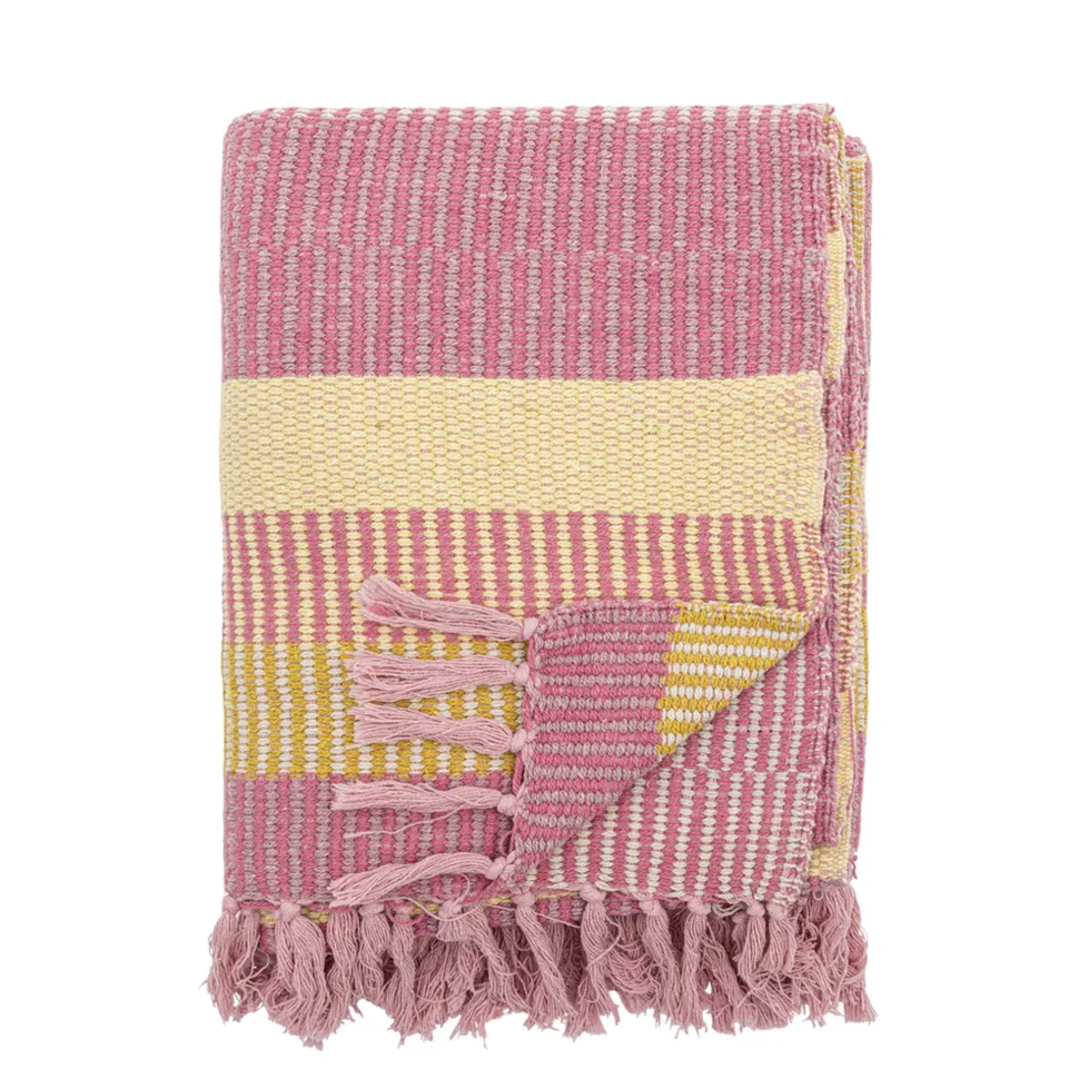 Diese schöne Decke Isnel aus recycelter Baumwolle von Bloomingville Boho Living macht jede Sitzgelegenheit noch bequemer. Die Farbkombination aus Blau, Pink und Gelb Tönen bildet einen interessanten Kontrast, der ein toller Blickfang in deinem Wohnzimmer oder Schlafzimmer ist. An den kurzen Seiten befinden sich beige Fransen, die diesem Überwurf einen noch behaglicheren Look verleihen.