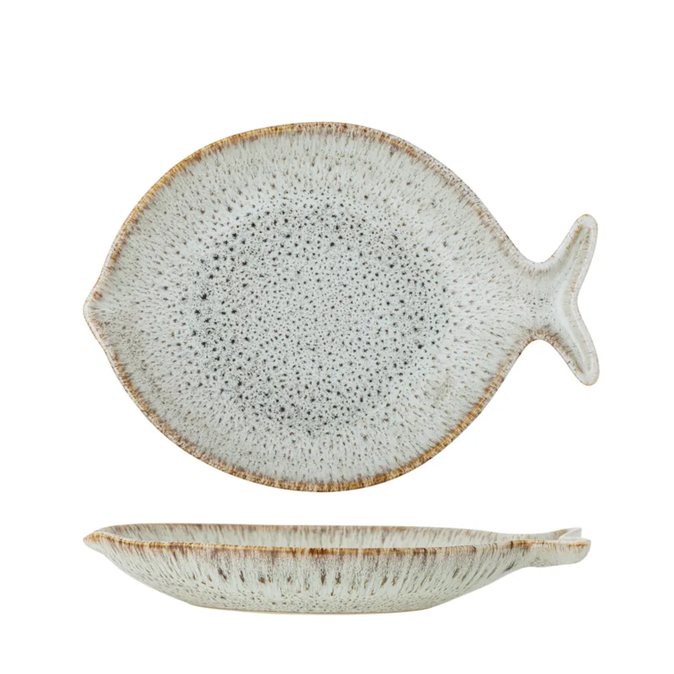 Fleur Servierplatte, Natur, Steingut von Bloomingville aus Dänemark. Die Servierplatte Fleur von Creative Collection ist aus Steinzeug gefertigt und hat die Form eines Fisches. Die gräuliche Glasur und die leicht rustikale Oberfläche verleihen der Schale Charakter und Persönlichkeit. Kleine Abweichungen können auftreten.