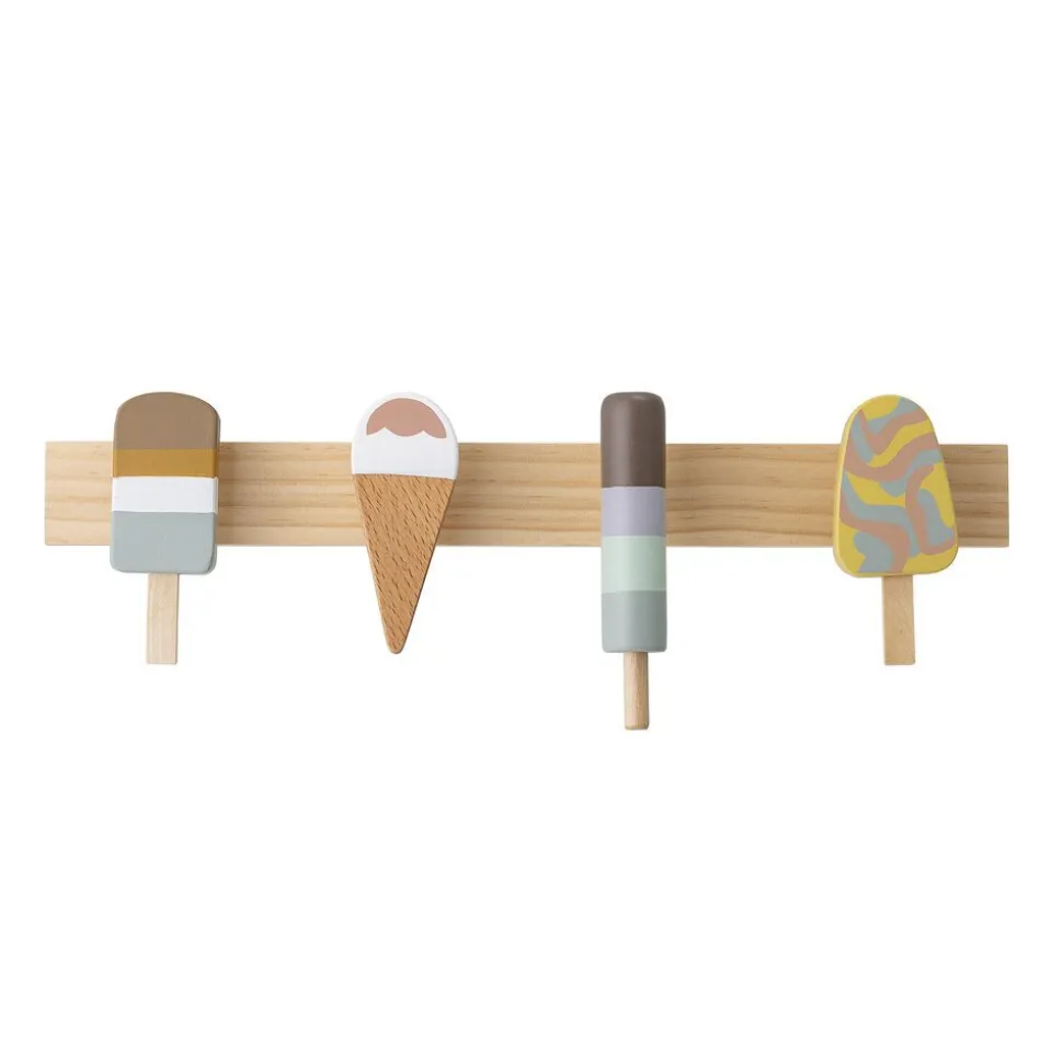 Diese niedliche Garderobe Zyon von Bloomingville Mini ist mit ihren Hacken in Form von Eis am Stiel ist eine besondere Wanddekoration fürs Kinder Zimmer oder den Eingangsbereich im Flur. Hänge Jacken, Schals, Taschen und Mützen auf, um Ordnung zu halten. Die Holz Garderobe passt besonders schön zu Möbeln aus Rattan oder Bambus.