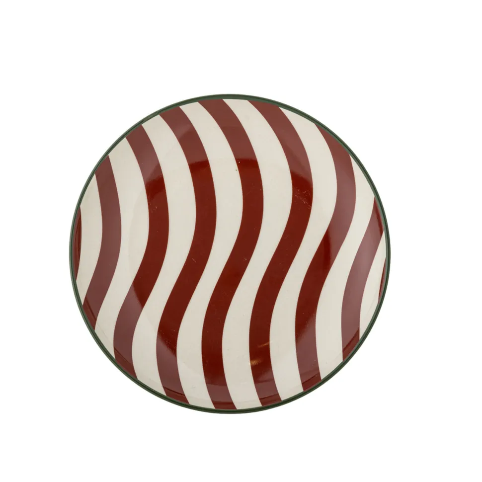 Jolly Teller, Rot, Steingut von Bloomingville aus Dänemark. Der Jolly Teller von Bloomingville ist ein eleganter Dessertteller mit einem gedruckten, gestreiften Motiv. Der handbemalte grüne Rand verleiht der Tischdekoration eine charmante Note und stellt sicher, dass jeder Teller einzigartig ist. Perfekt für alltägliche sowie festliche Anlässe, schafft der Teller eine warme und einladende Atmosphäre.