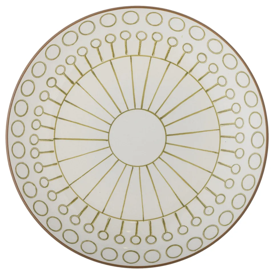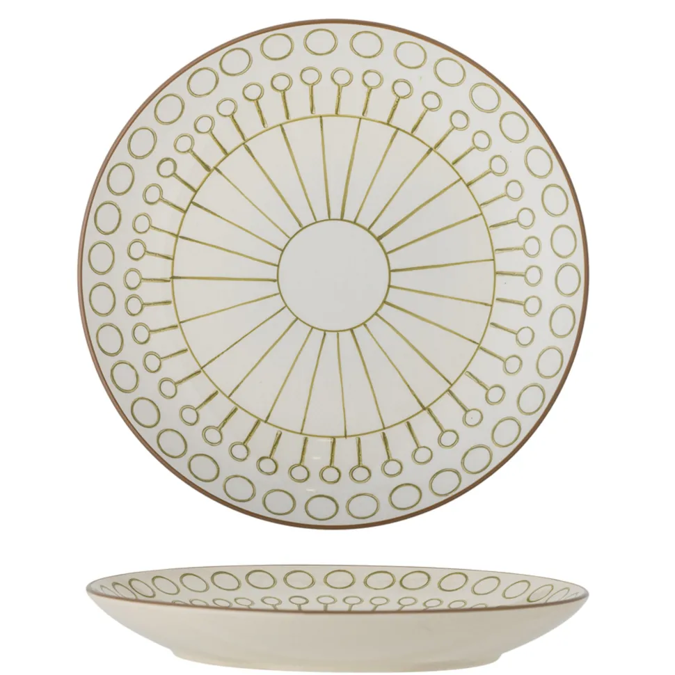 Maple Teller, Grün, Steingut von Bloomingville aus Dänemark. Der Maple Teller von Creative Collection ist ein eleganter Steingutteller, verziert mit einem modernen und geometrischen Muster in warmen gelben und goldenen Tönen. Das schlichte, aber auffällige Muster verleiht Ihrer Tischdekoration eine einzigartige Note, ideal für eine schöne und persönliche Präsentation.