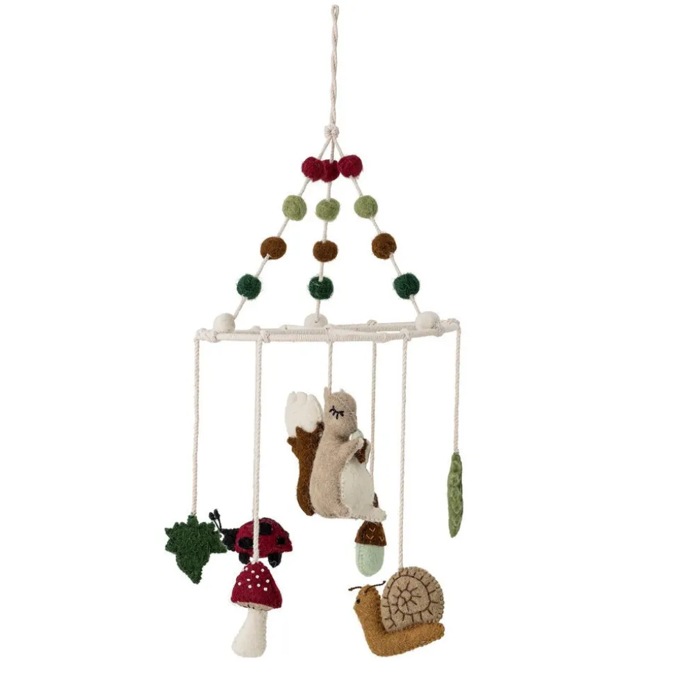 Dieses putzige Mobile Idun aus Wolle von Bloomingville Mini hilft deinem Liebling ruhig und schnell einzuschlafen. Das Natur Thema mit niedlichen Tieren und schönen Pflanzen ist wunderschön anzusehen. An der Spitze befinden sich bunte Woll Kügelchen. So ist dieses Mobile ein tolles Geschenk zur Geburt oder Taufe.