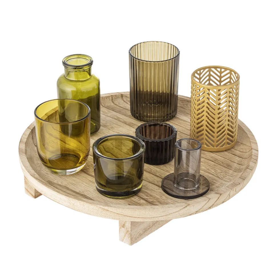 Sanga Tablett mit Teelichthaltern, Natur, Glas von Bloomingville aus Dänemark. Das Tablett Sanga mit Kerzenhalter von Bloomingville ist eine wunderschöne und elegante Dekoration. Sie enthält ein rundes Tablett auf Füßen aus Paulownia-Holz und sieben kleine Kerzenhalter, die Sie für Deko oder Kerzen nutzen können, um eine gemütliche Atmosphäre zu schaffen.