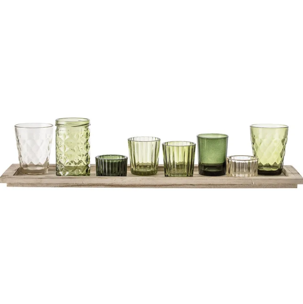 Das stilvolle Tablett besteht aus insgesamt 9 Teilen und wird durch 8 kunstvolle Kerzengläser geschmückt. Arrangiere die verschiedenen Kerzengläser ganz nach deinem Geschmack oder verleihe dem Tablett einen persönlichen Touch durch deine eigenen Dekorationen.