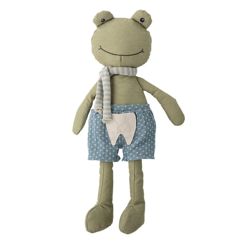 Diese schöne Soft Toy namens Freddy die Zahnfee von Bloomingville Mini wird der neue beste Freund deines Kindes. Der grüne Frosch trägt einen gestreiften Schal und eine blaue Hose mit einer Zahn Applikation.