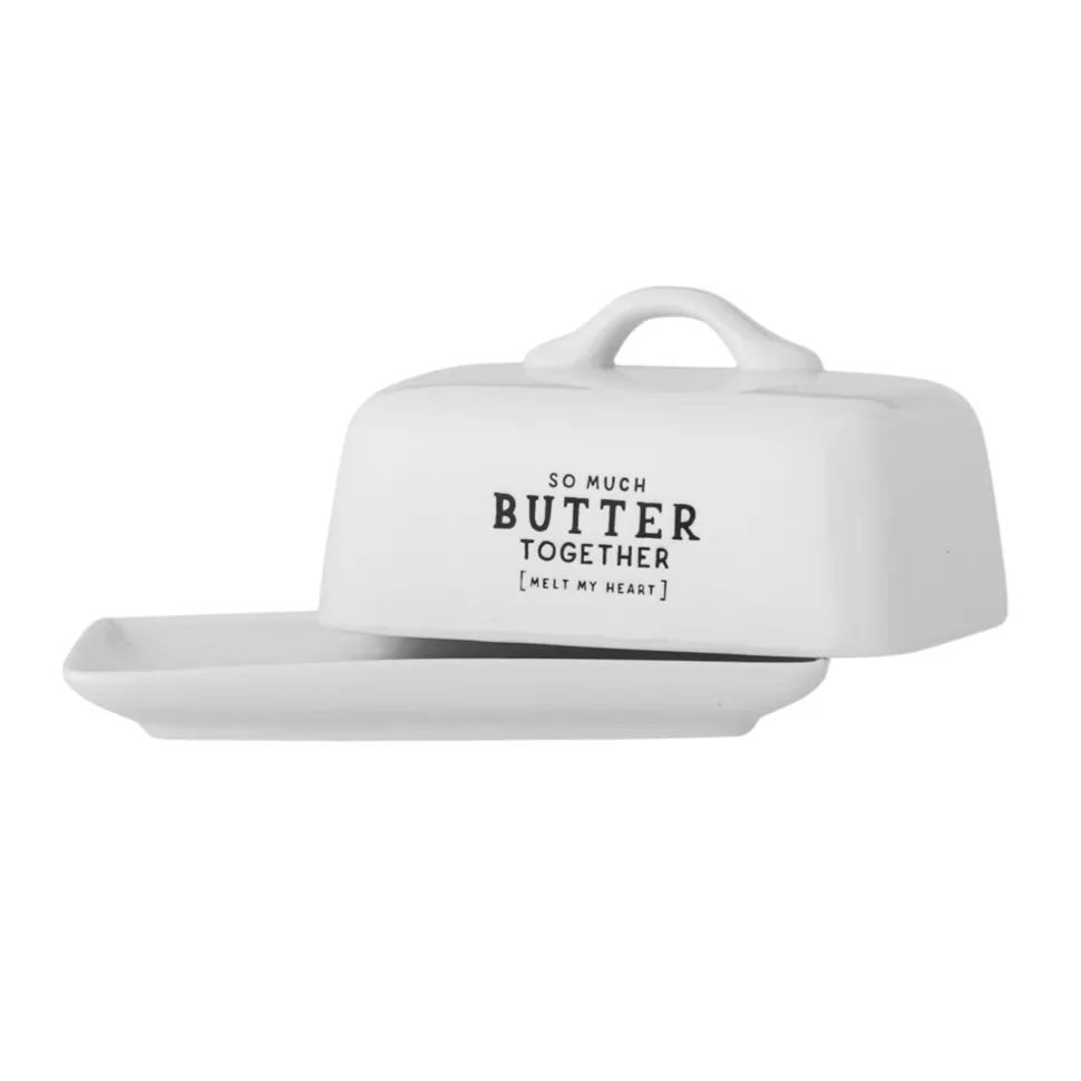 Wendy Butterdose, weiß, Steingut von Bloomingville aus Dänemark. Wendy Butterdose von Creative Collection mit dem Zitat „so much butter together (melt my heart)“ ist eine gemütliche und praktische Aufbewahrung für Butter. Die Butterdose ist mit einem Griff versehen, der das Anheben des Deckels und das Servieren der Butter auf dem Unterteller erleichtert. Das süße und lustige Design ist aus Steingut mit einer weißen Glasur und schwarzem Druck gefertigt.