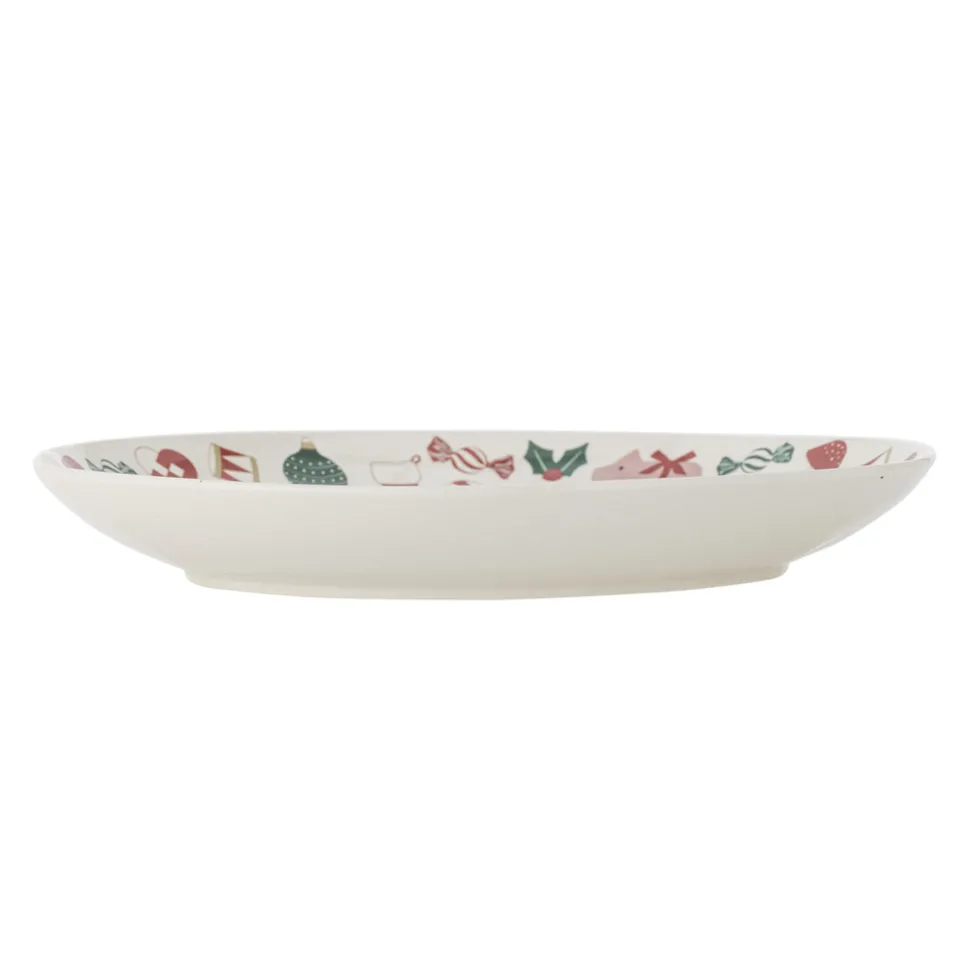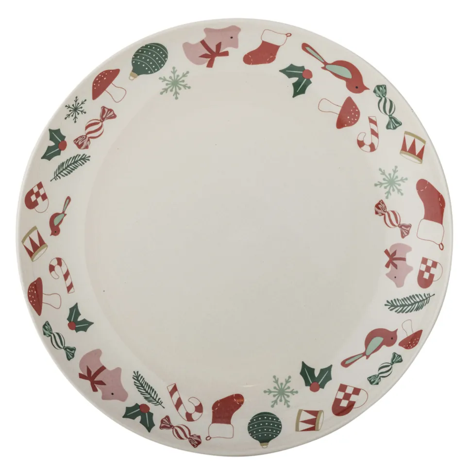 Yule großer Teller, Servierplatte, Natur, Steingut von Bloomingville aus Dänemark. Der Yule Servierteller von Bloomingville ist ein idealer Abendessenteller für die Feiertage. Er ist mit einem charmanten Muster aus Weihnachtsmotiven verziert, das eine gemütliche und einladende Atmosphäre am Tisch schafft.