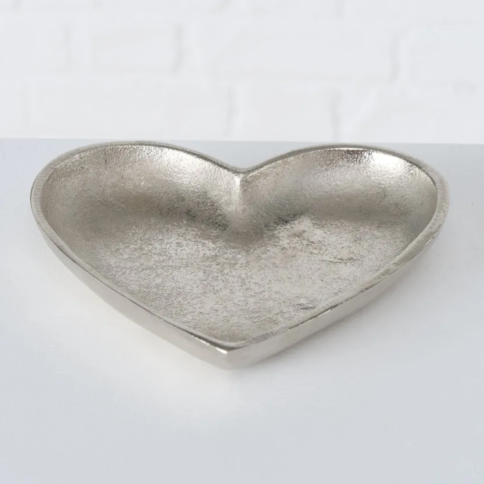 Die Schalen aus Metall mit Aluminium vernickelt in Herzform kommt in 2 verschiedenen Größen (16/17 cm x 24cm)