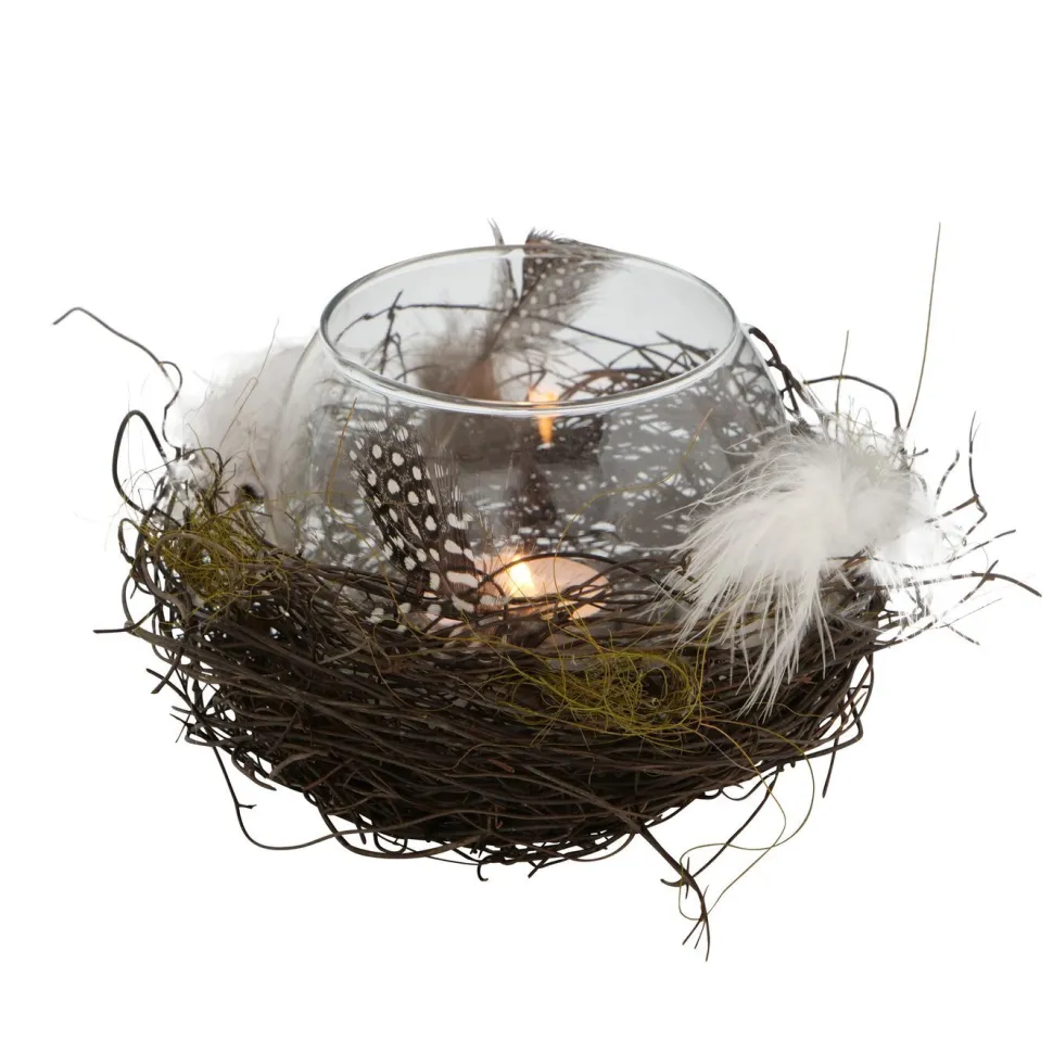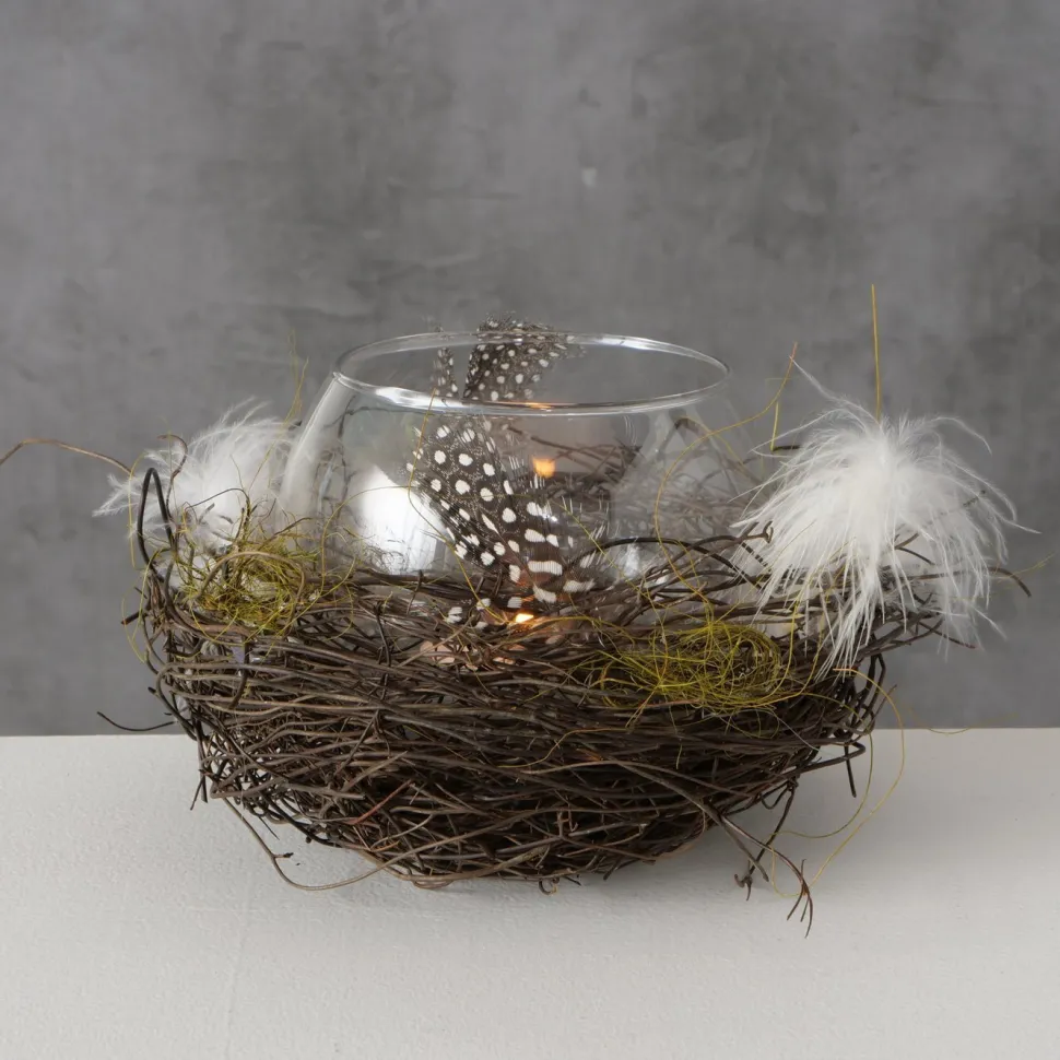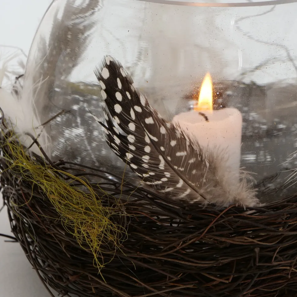 Mit dem schönen Windlicht Emil von Boltze schaffst du ein gemütliches Gefühl für dein Zuhause. Dabei ist es mit seinen Sträuchern und Federn wie ein kleines Nest, aus welchem warmes Licht strahlt. Das Windlicht kann wunderbar auf dem Esszimmertisch oder auch einem Sideboard platziert werden und lädt zum Wohlfühlen ein.