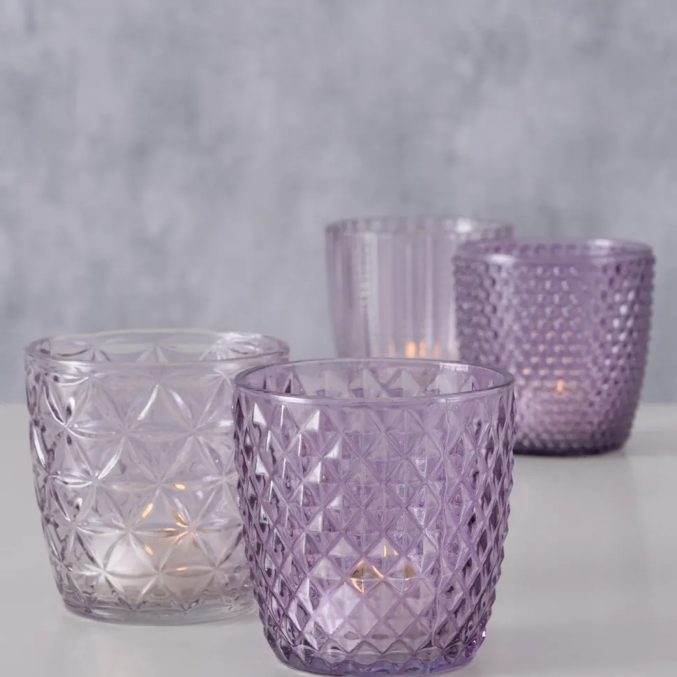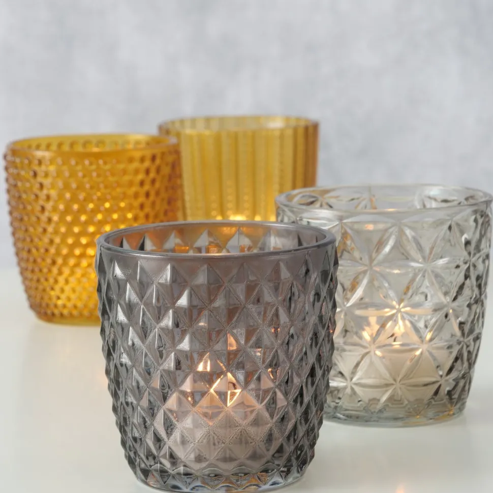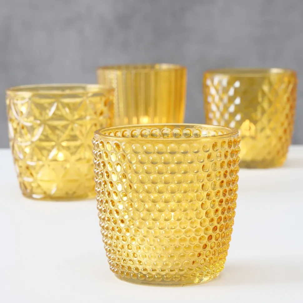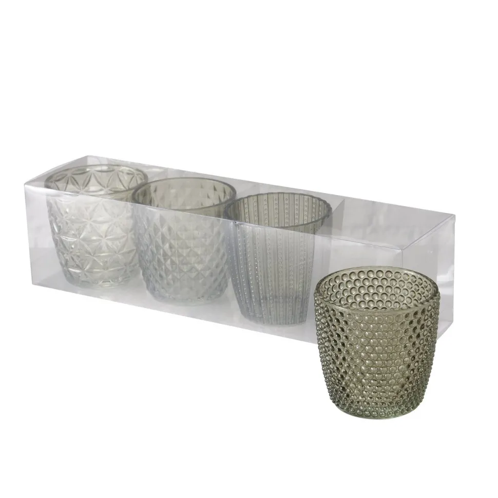 Das Set besteht aus vier Gläsern mit verschiedenen Mustern in der Oberfläche. Es kann wunderbar zusammen gestellt werden, oder aufgeteilt und an verschiedenen Orten platziert werden.