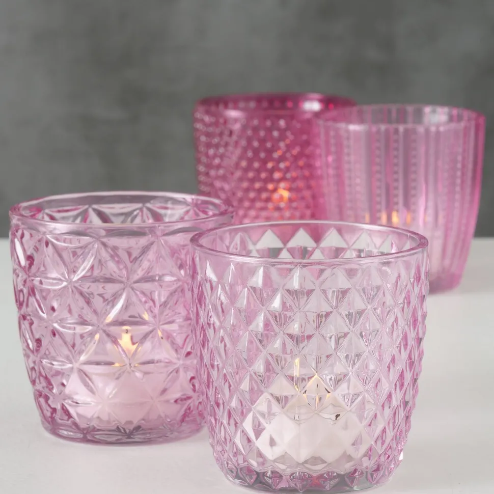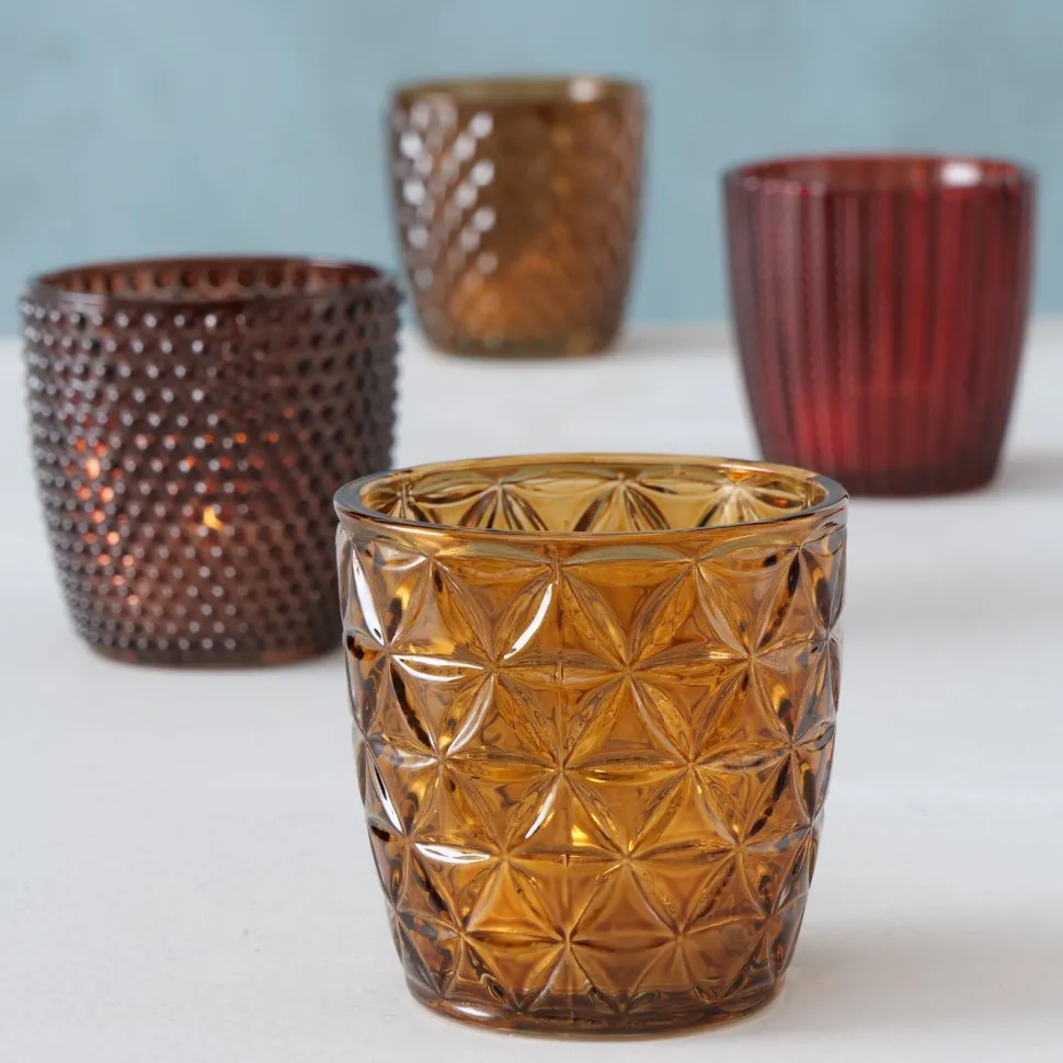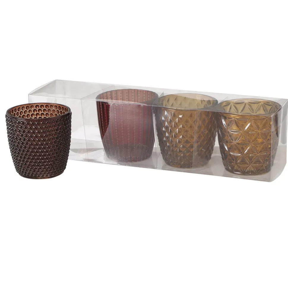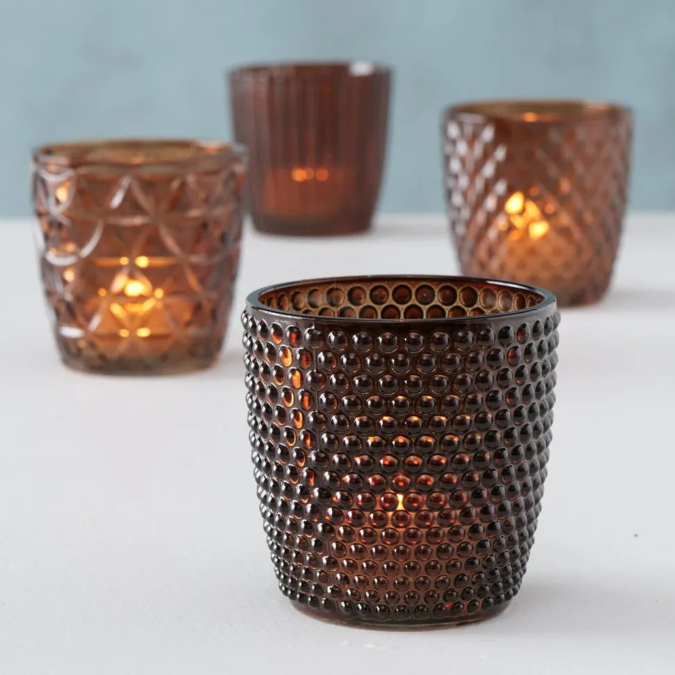 Das Set besteht aus vier Gläsern mit verschiedenen Mustern in der Oberfläche. Es kann wunderbar zusammen gestellt werden, oder aufgeteilt und an verschiedenen Orten platziert werden.