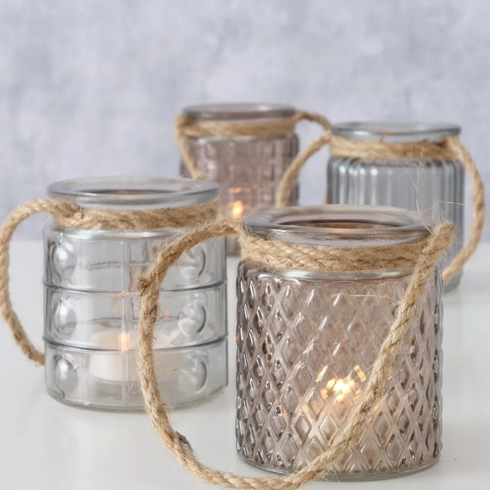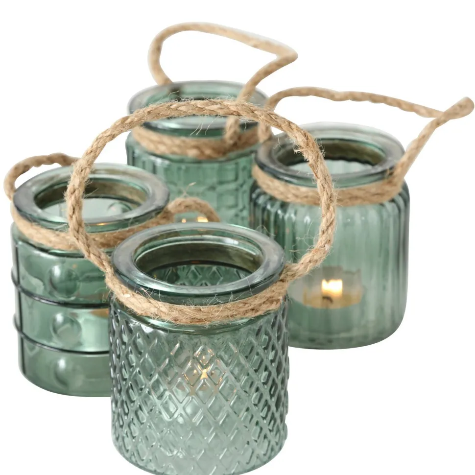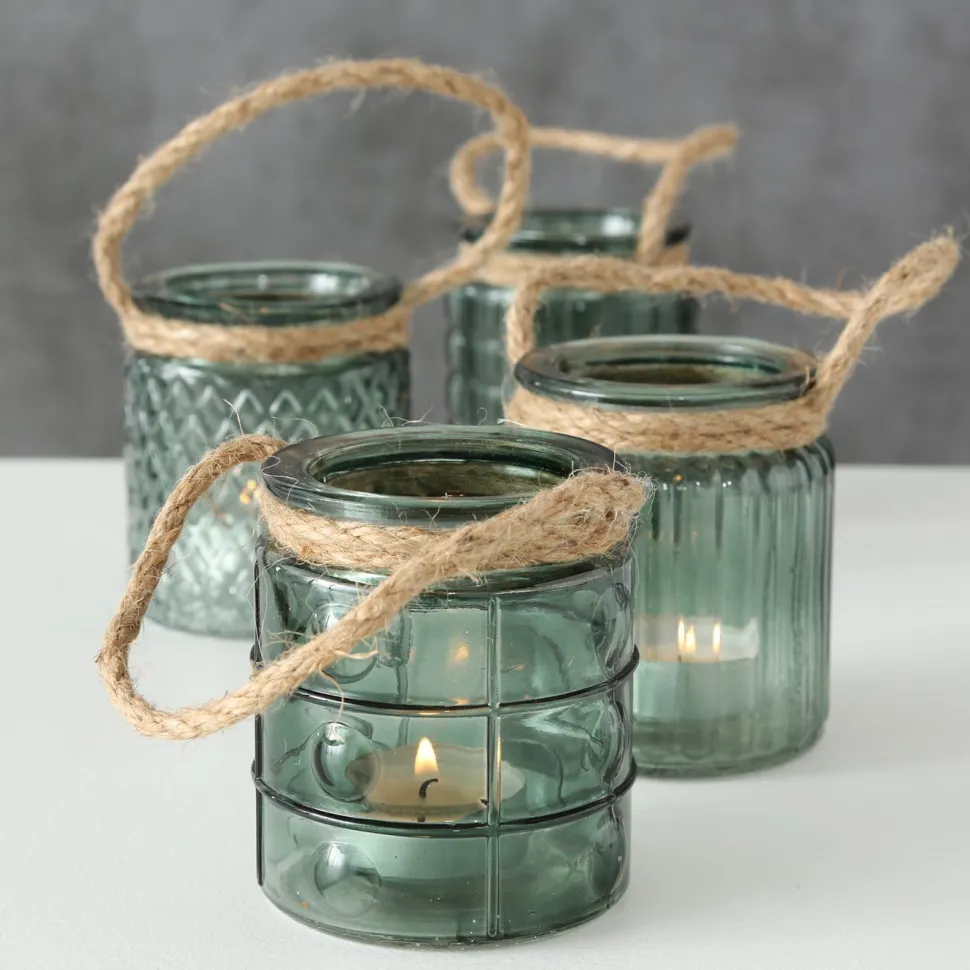 Gleich vier verschiedene und tolle Modelle auf einen Streich bekommst du mit diesen schönen Teelichtgläsern von Boltze in türkis-grün. Du kannst sie sowohl auf dem Tisch platzieren, aber auch an ihrem natürlichen Band in die Lüfte hängen.